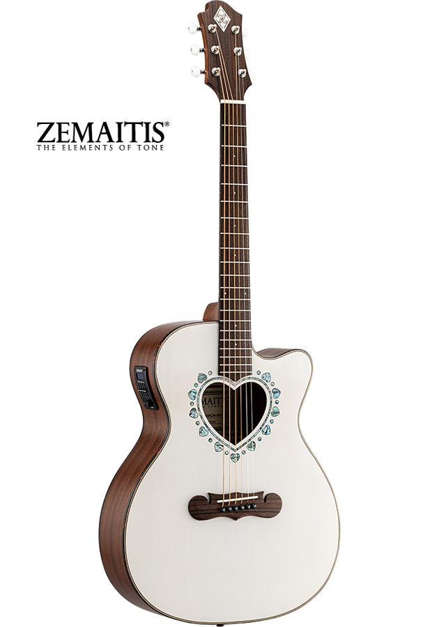ハート型サウンドホールのオーケストラ・モデルのCAF-90Hとオーケストラ・カッタウェイ・モデルのCAF-90HCWは、マザー・オブ・パールのダイヤモンド・インレイが輝く特徴的なヘッドストックを持ったマホガニー・ネックにローズウッド・フィンガーボードを採用した20フレット仕様の14フレット・ジョイントとなっています。ゼマイティスの伝統的なハート型のサウンドホール、その周縁に施されたアバロン柄のハートをちりばめたロゼッタ、マスターシュ・ブリッジのオリジナル・デザインは、非常に魅力的です。トップ・ブレイシングはサウンドホールの形状やボディーのサイズを考慮して、最大限の鳴りを引き出すためにフォワードXブレイシングを採用しています。ボディー・トップは板材の時に真空状態で熱を加えることで余分な水分やミネラルを取り除いたソリッド・スプルースを使用し、サイドとバックにはサペリを用いて狂いの出にくい安定したボディ剛性を実現しました。ヘッドストックの突板にはローズウッドを使用し、ペグのボタンはパーロイドを採用しています。ボディー・サイドには4バンドEQとクロマティック・チューナー機能を持ったプリアンプを搭載し、お好みのトーンでアンプなどの外部機器に出力できます。カラーは、アンティーク・フィニッシュのホワイトです。