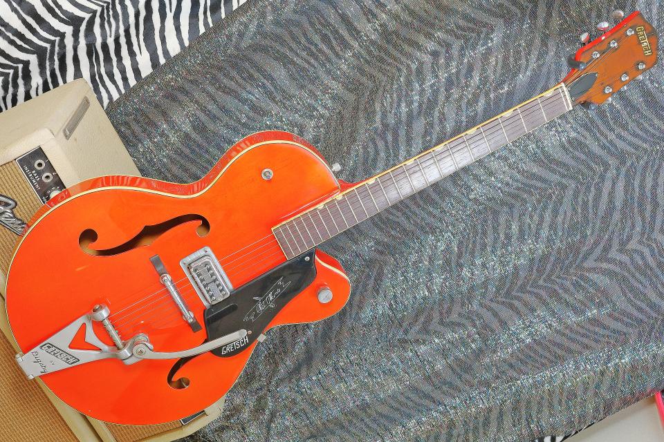 このモデルもチェット・アトキンスのシグネーチャー・モデルで、2ピックアップ仕様の#6120に対する1ピックアップ・バージョン、更にはfホールやヘッドストックのバインディングを省略し、パーツのメッキも#6120のゴールドではなくクロームというところで差を付けた廉価版モデルとしての位置付けです。