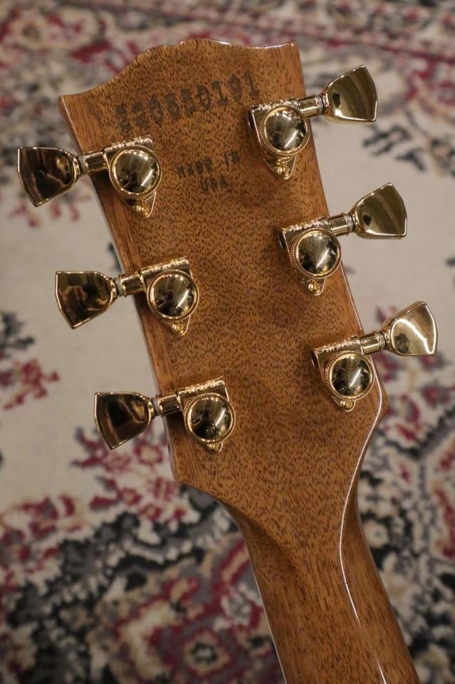指板にはこれまたギブソン最上位モデルの定番、エボニーがチョイスされております。ポジションマークにはMother of Pearl Super Split Blockが選ばれました。このデザインはギブソン・アーチトップギターの最高峰、Super 400で採用されている伝統的なものです。