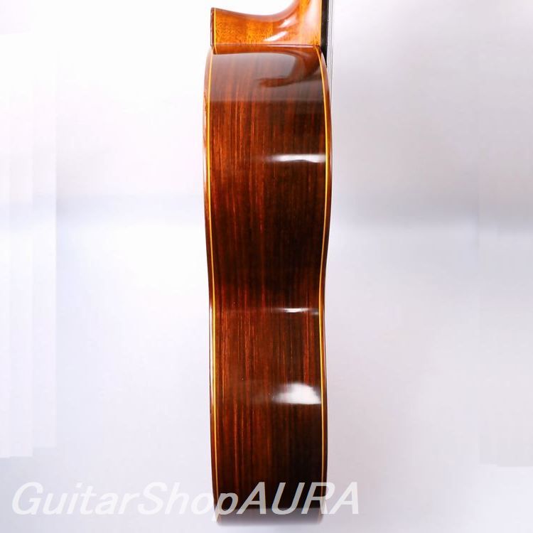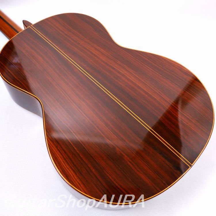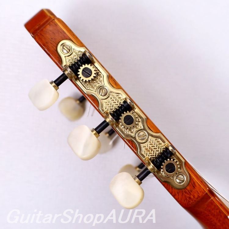 おそらくはセコイア杉を使用した表面板と、野趣を感じさせる(オリベはフォトジェニックな材のセレクトに非常なセンスを発揮しています)横裏板のココボロ材との組み合わせ、そして悠揚たるボディデザインやゴシック建築の尖塔を想起させるヘッドシェイプなど、全体の重厚で気品あふれる外観は彼ならでは。細部に至るまでに繊細な手の行き届いた造作も申し分なく、当時ラミレスと並ぶほどの人気を博しました。※横板は内側に別種の材を貼り付けての二重構造になっており、この点はラミレスと仕様を一にしています。