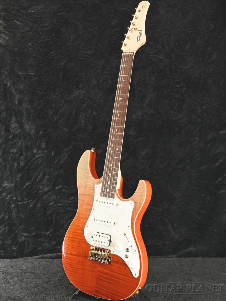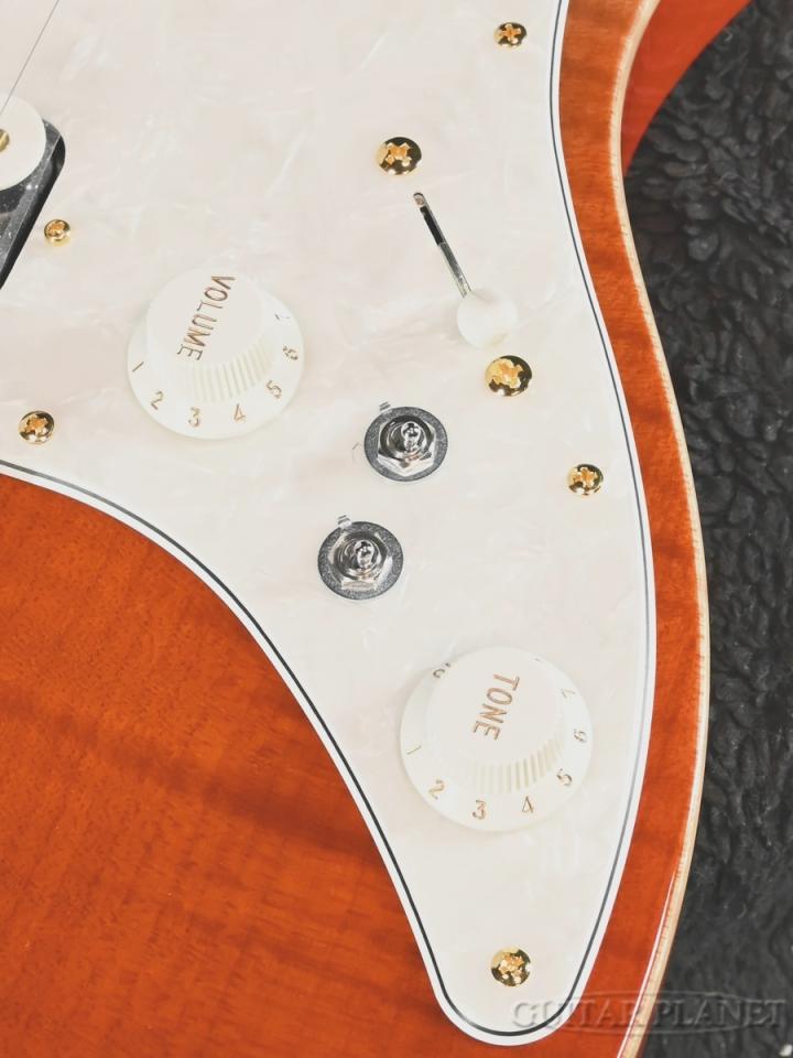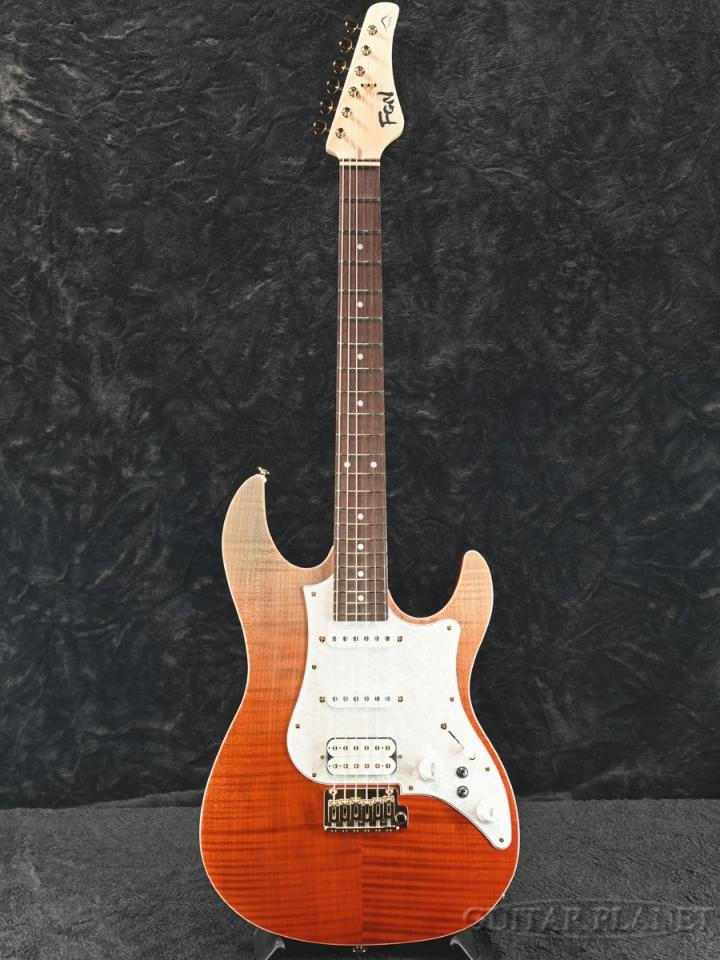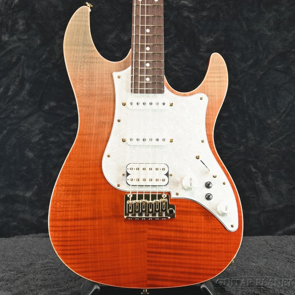 美しいフレイムメイプルのボディトップに、熟れた柿をイメージしたライプ・カキ・グラデーションのカラーリングが映える特別な一本。