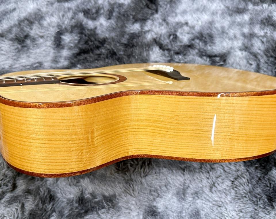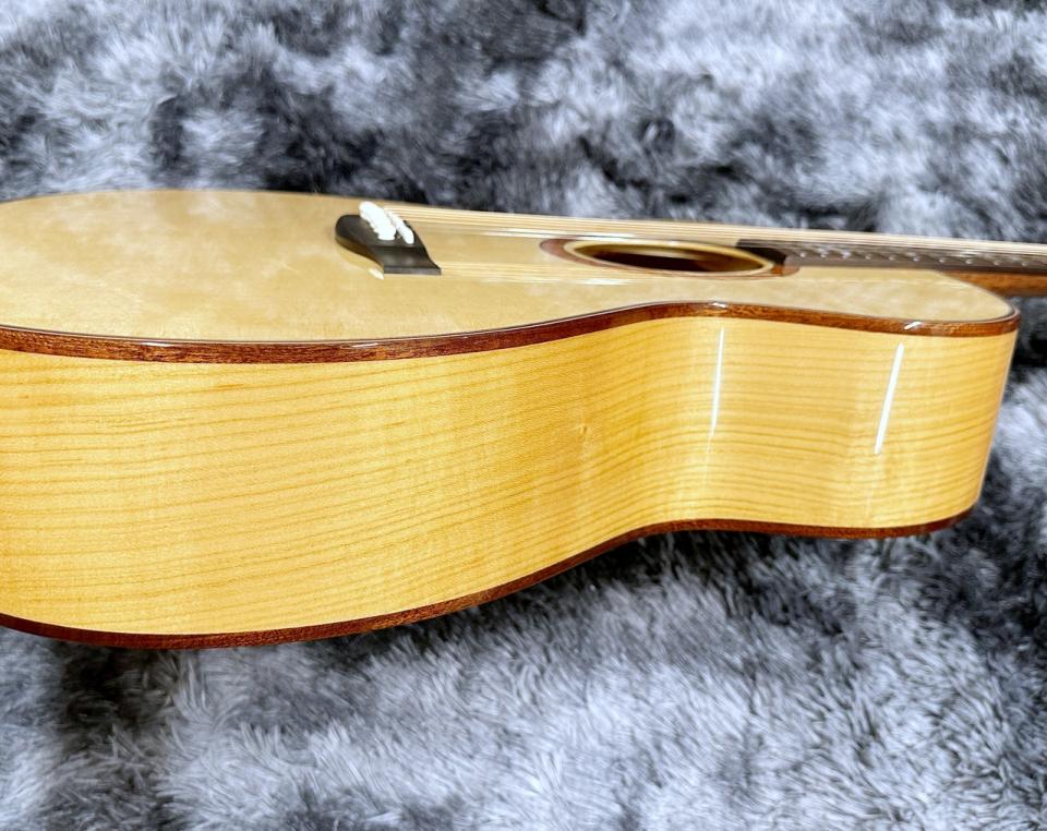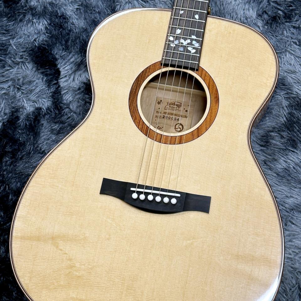 元となったギターと同様に、小ぶりなボディシェイプを採用し、サイドバックには国産の桜材、指板には縞杢が際立つエボニー材を選定。ボディにはあえてピックガードを取り付けず、装飾をシンプルに抑えることで鳴りを最大限に引き出しています。