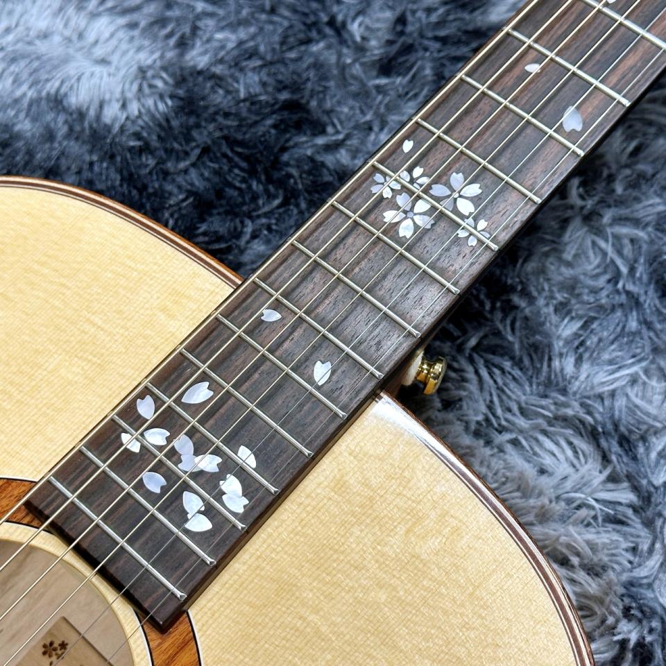一方で、ヘッドと指板には白蝶貝やアバロンを用いて華やかな装飾を施しました。ヘッドに咲き誇る満開の桜から、桜の幹に見立てた指板上へと花びらが「零れ落ちていく」様子を白蝶貝で描き、おさむらいさんが思い描く桜の情景を表現しています。