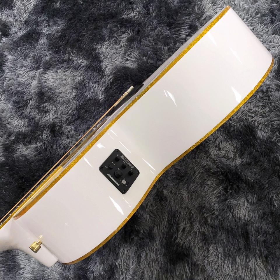 ジャンボカッタウェイを採用し、ボディトップ&バック、サウンドホール、指板、ヘッドストックに、まばゆいゴールドスパークル・バインディングが施されています。