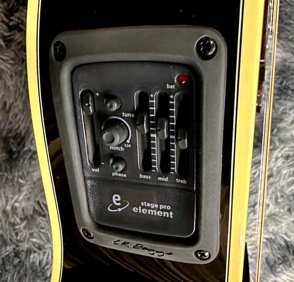 ピックアップにはクロマティックチューナー、3バンドイコライザー、ハウリング対策のノッチフィルター、フェイズスイッチを搭載したL.R.Baggsの「StagePRO element」を装備。様々なシチュエーションのステージに対応しつつ、アコギのナチュラルなサウンドを出力します。サウンドホールが無いことでハウリングに強く、まさに実戦仕様のライブで大活躍するエレアコに仕上がっています。
