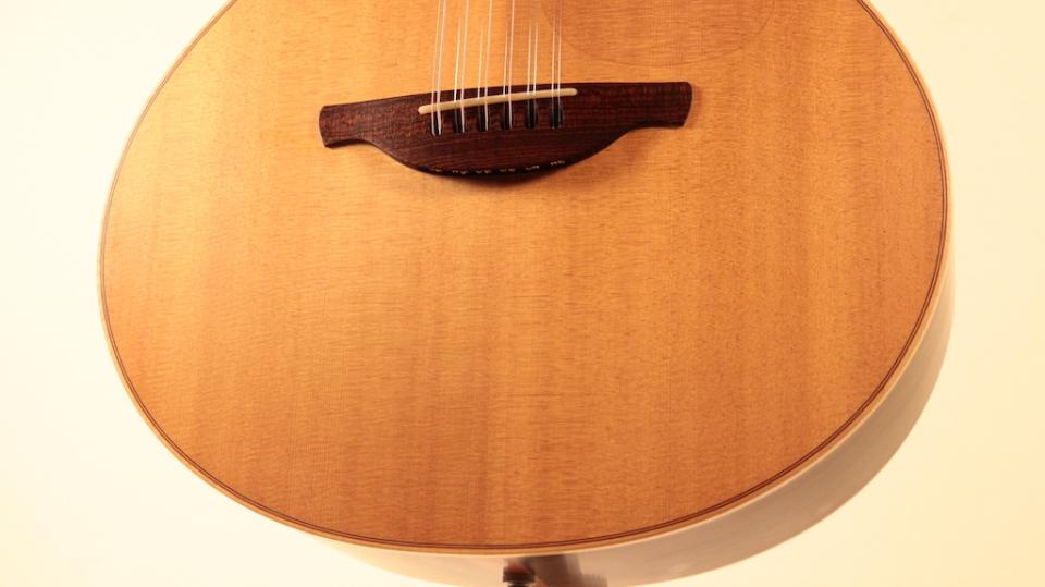 低音から高音までバランスよく響き、繊細さと力強さを併せ持つFサイズのボディシェイプに、シトカスプルーストップにインディアンローズウッドのサイド&バック。