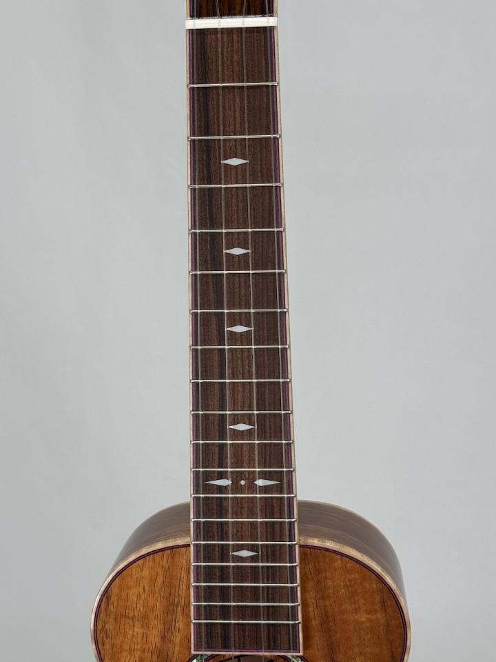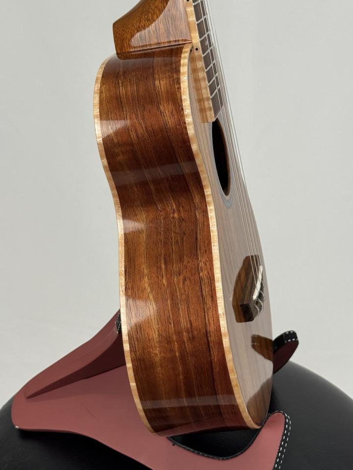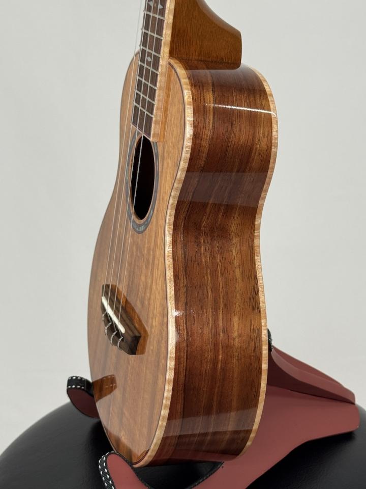 THCの型番はコンサートの定番シェイプです。ボディの材料には2Aグレードのハワイアンコアを使用しています。