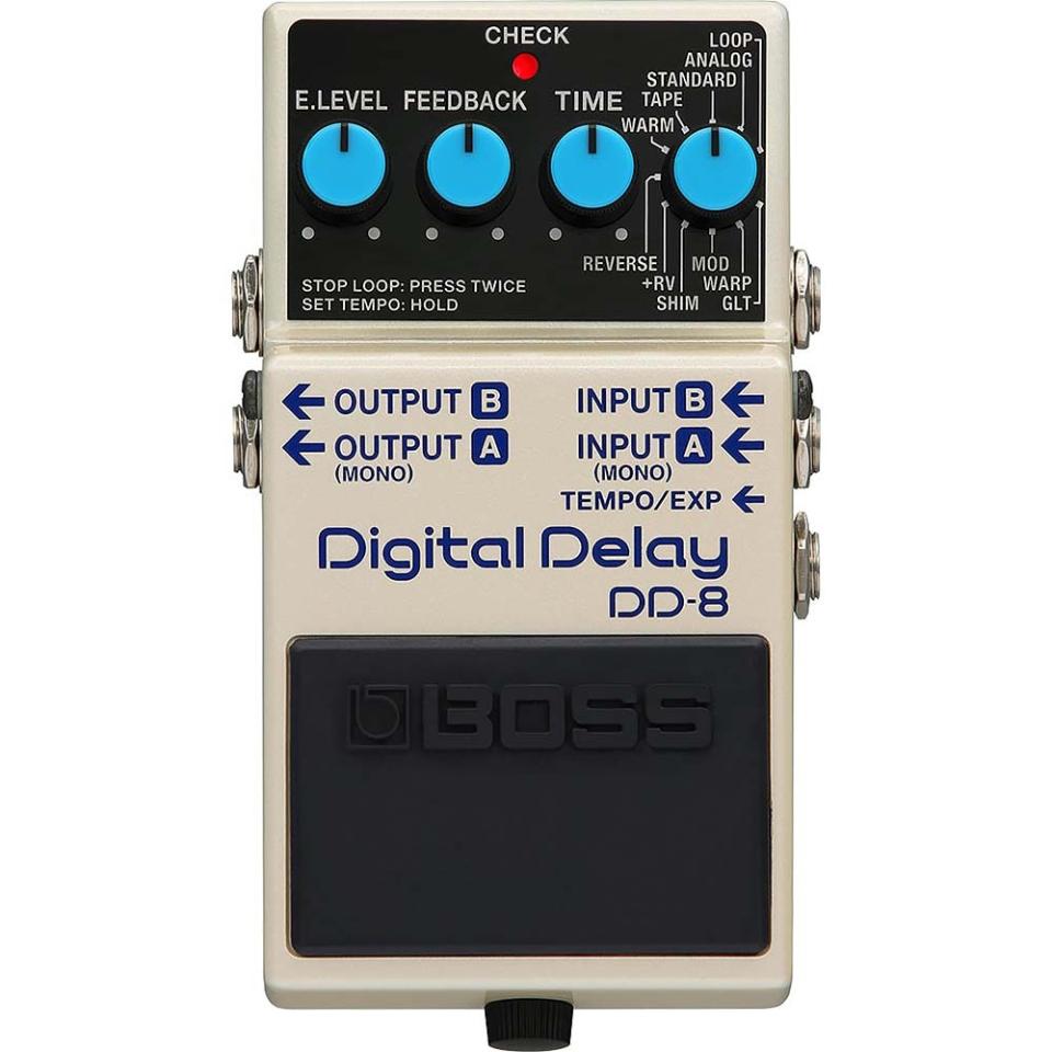 DD-8 Digital Delayは、BOSSコンパクト・ディレイ・ペダル史上最もワイドレンジで多機能なディレイ・ペダルです。多彩なサウンド、柔軟なディレイ・タイム、豊富なコントロール・オプションと接続端子など、あらゆる面で優れたスペックを誇ります。また、モノ/ステレオの入出力に対応し、様々な接続が可能です。