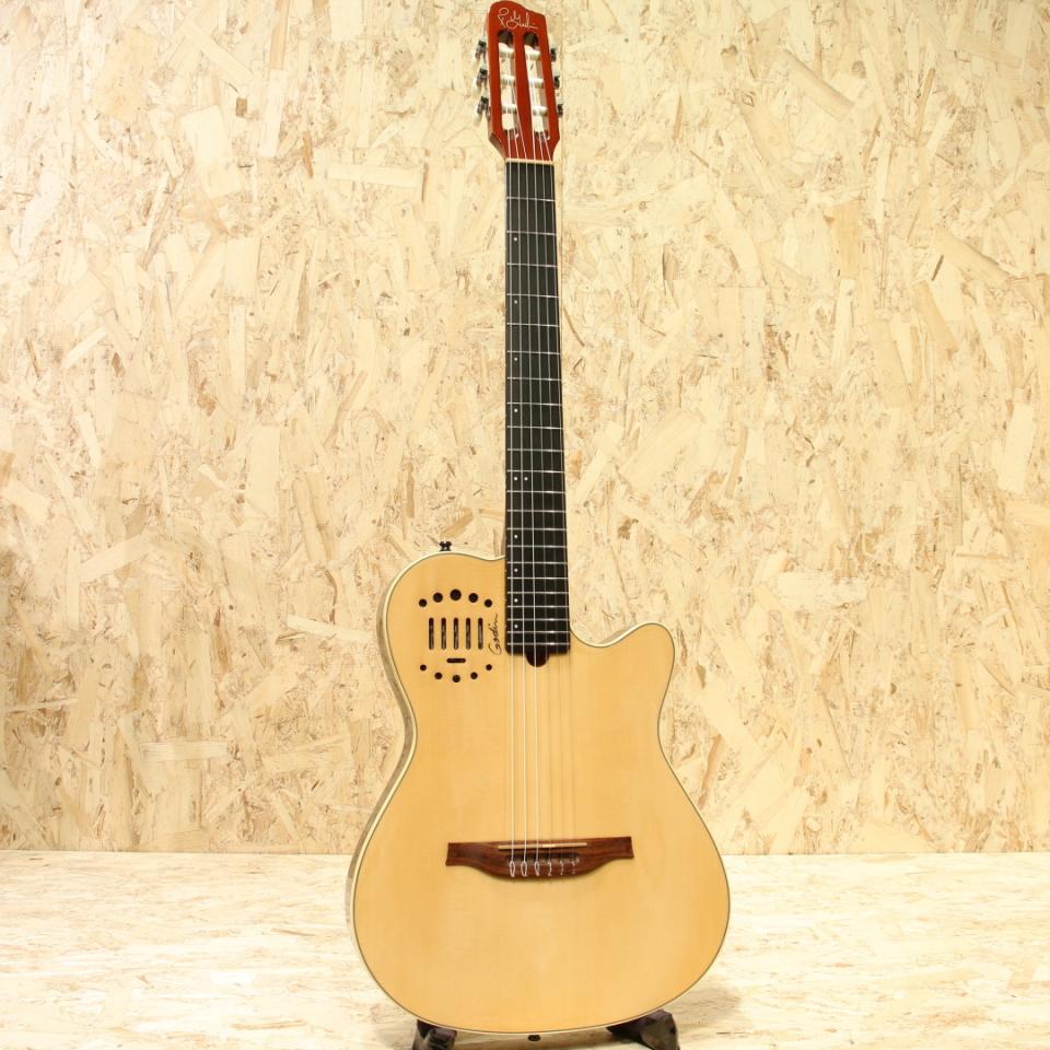 北米大陸最大級を誇るファクトリーをカナダにもつ"Godin(ゴダン)"。材の見た目だけでなく剛性や弾力性のテスト等の徹底した材や品質の管理、常に新しいアイデアを模索し実践、進化し続けるファクトリーブランドです。本器は同ブランドの中でも人気の高いエレガットモデル"Multiac Nylon Duet Ambiance"。2015年製USED品。スプルーストップ、マホガニーS&B、チェンバーボディ、リッチライト指板&ブリッジ、ギターの生音をスタジオマイクで収録したときと同等のサウンドイメージを作り出し、ピエゾサウンドにブレンドすることで、ハウリング等に悩まされること無くリアルなエアー感を作り出します。実際のプロ用定番マイクと同じ特性を忠実に再現した、4種類のサウンドキャラクターが選べます。ピックアップサウンドは音の芯を感じながらも非常にナチュラル。バンド編成の中のアクセントとしても有望、昨今では弾き語り等でも活躍の場が見られるオールマイティに活躍するエレガットです。クラシックとアコースティックの中間で演奏性の高い約48mmナット幅はアコギ/エレキからの持ち替えでも違和感の少ない仕様。その見た目からは想像のつかない甘くナチュラルなナイロンサウンドは本モデルならではです。ヘッド裏の際部分に細かな打痕、その他擦れ傷などございますが、演奏に関わるような使用感は見られません。ネックコンディションも良好、低めなセッティングで技巧的なプレイスタイルにもしっかり対応します。プロユースとしても高い評価を誇るゴダンエレガット。比較的使用感の少ないグッドコンディションの1本です。オリジナルソフトケースが付属します。