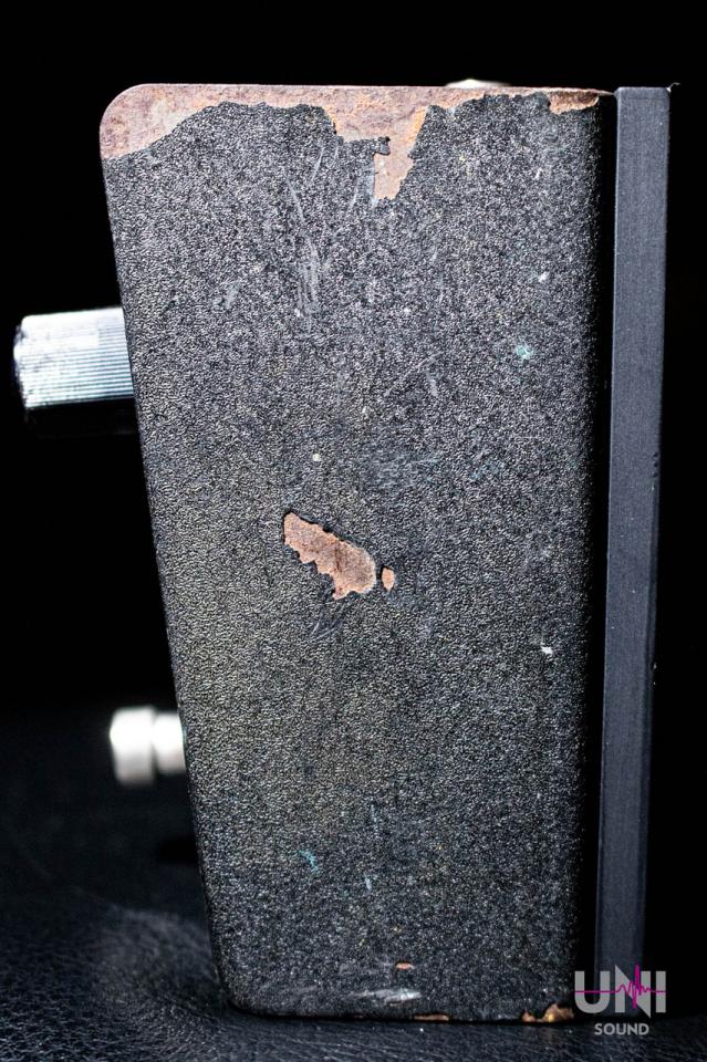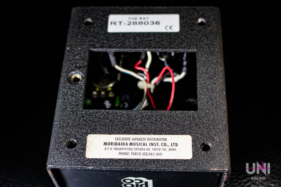 今回入荷したのはペダル上面から「Proco」ロゴを廃し、RATロゴの「A」の中央にLEDを搭載したモデル、「RAT2」。シリアルは「RT-288036」、CEマークが表記されています。下部にはモリダイラ楽器のシールがあり、電源ジャックはミニプラグです。現在はその上からペダルボード用の蓋が新たに取り付けられており、オリジナルの電池蓋は欠品です。