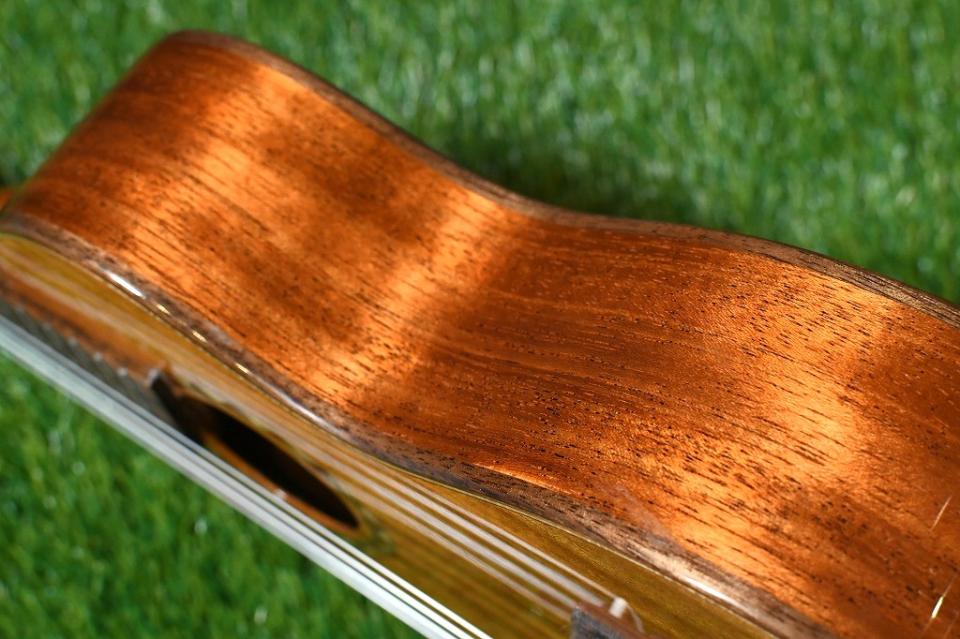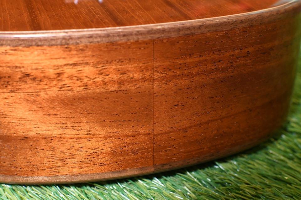 トップ・バックに単板を使うことで鳴りを良くし、カリン材を織り交ぜたロゼッタやバインディングが綺麗なモデルです。