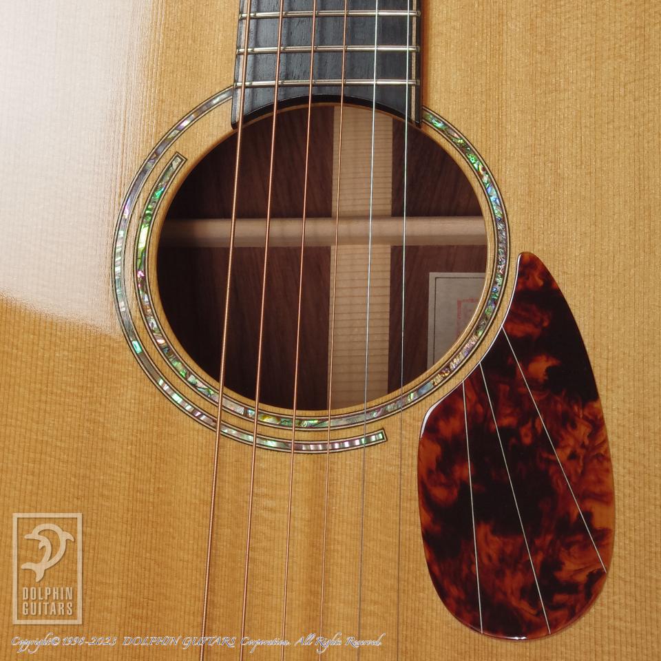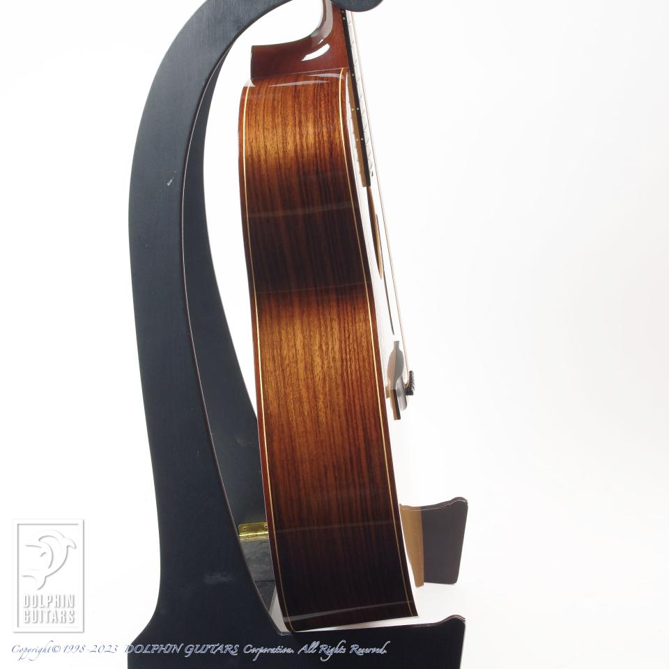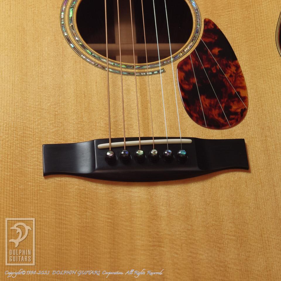 一般的なOMを最大厚で約15mmほど厚胴したボディサイズであり、低音の深みや音域の広さを感じさせるサウンドです。ピッキングの強弱もしっかりと反応し、豊かな表現力を持つ個体で、抜群な鳴りの良さからテンション感も適度な柔らかさを感じるほどです。日高氏はプリウォーマーティンスタイルのアメリカンサウンドの製作も得意とし、本器もベースとなる音作りはプリウォースタイルですが、日高氏のアレンジを加えたブレイスパターンとなります。