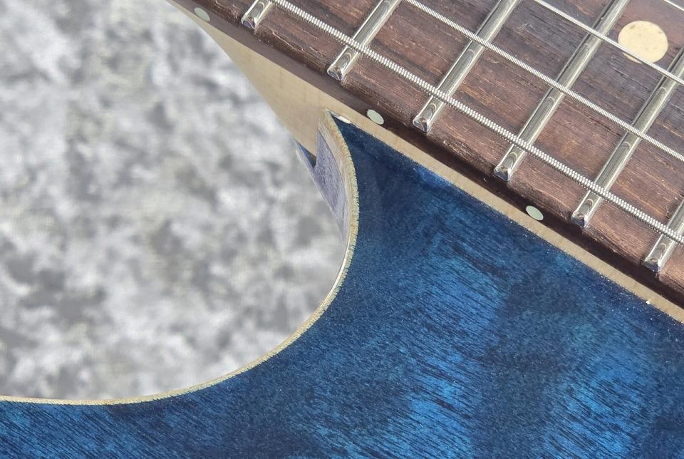 2Pのアルダーに6mm厚のキルトメイプルを貼り合わせたボディとローズ指板のメイプルネックというマテリアル構成で、