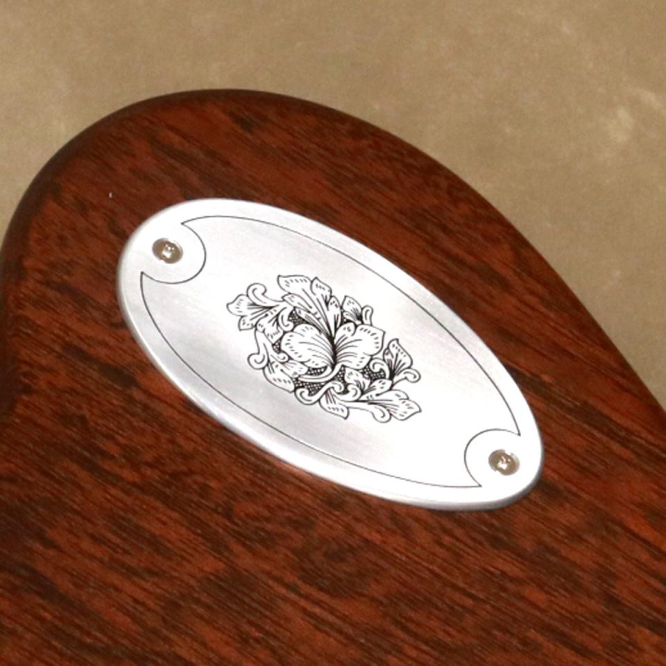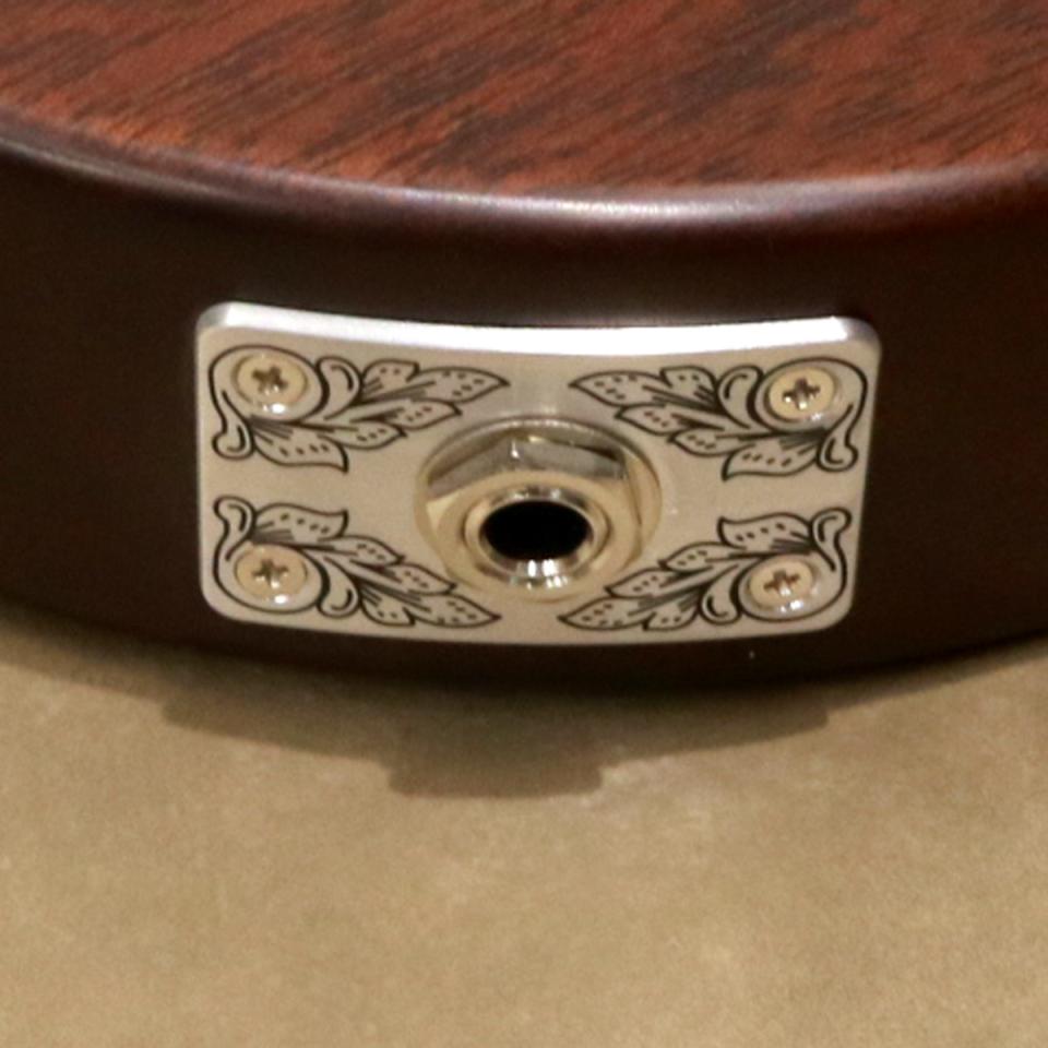 同様にアルミ合金を用いたヘッドのアローヘッド型ブランド・エンブレム、トラスロッド・カバー、テイルピースやスイッチ・プレートをはじめ、アウトプット・ジャック・プレート、コントロール&スイッチ・バック・プレートに至るまで彫金を施しています。