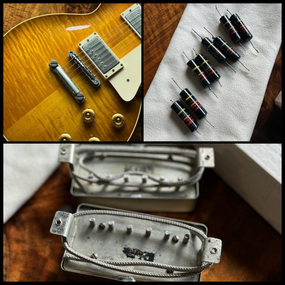 ピックアップには、大変貴重な68年~74年頃までのステッカー・ナンバードPAF、通称「T-bucker」をマウントし、キャパシターには50年代のビンテージレスポールに実際にのっていたスプラグ社製造の希少な「50's Original Bumblebee 0.022uF/400V」キャパシターを搭載。