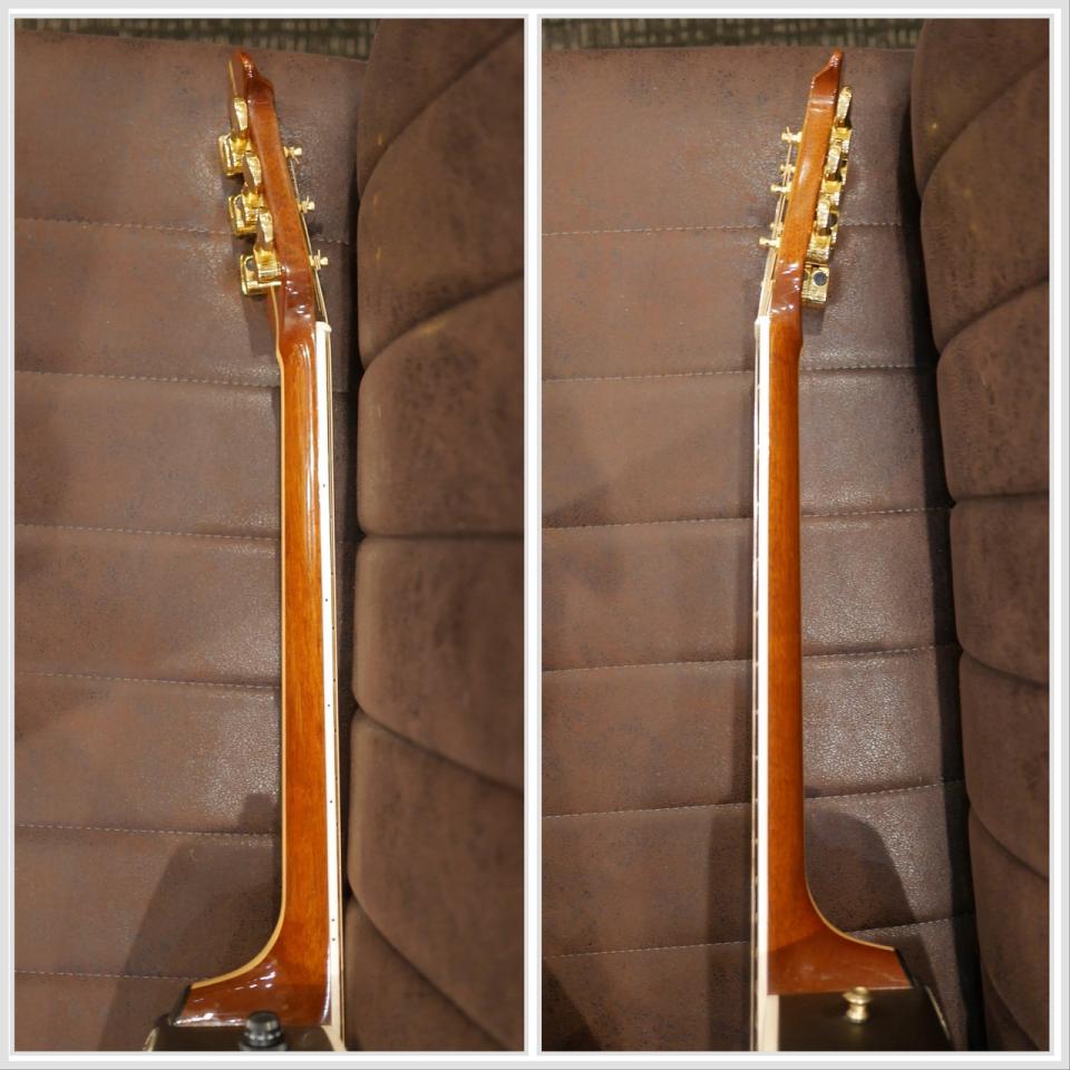 ネックは通常の範囲内でストレート、弦高は12フレット上で6弦側1.5mm,1弦側1.5mmと、低目にセッティングされており、強めに弾くと低音弦に若干のビビりを感じますが、音詰まりが発生する箇所はございません。