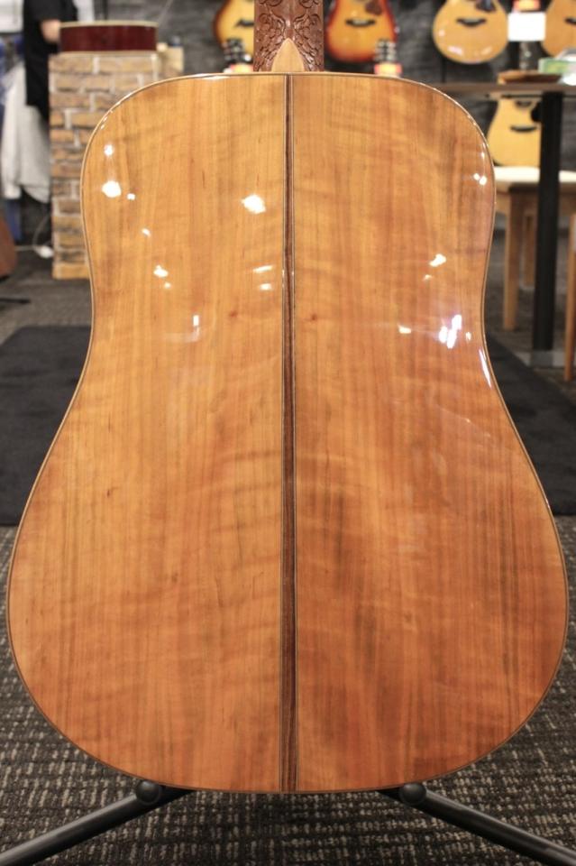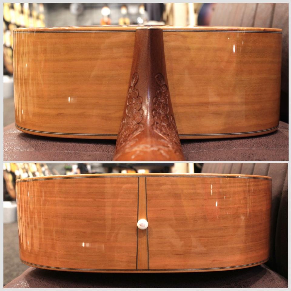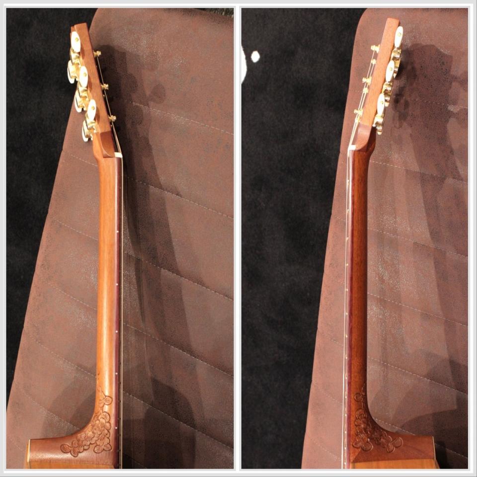 ネックヒール部とブリッジには、軽井沢彫シバザキ氏による桜の彫刻を施し、クラフトマンシップと伝統工芸の融合を実現。木工芸としての美しさも見逃せません。