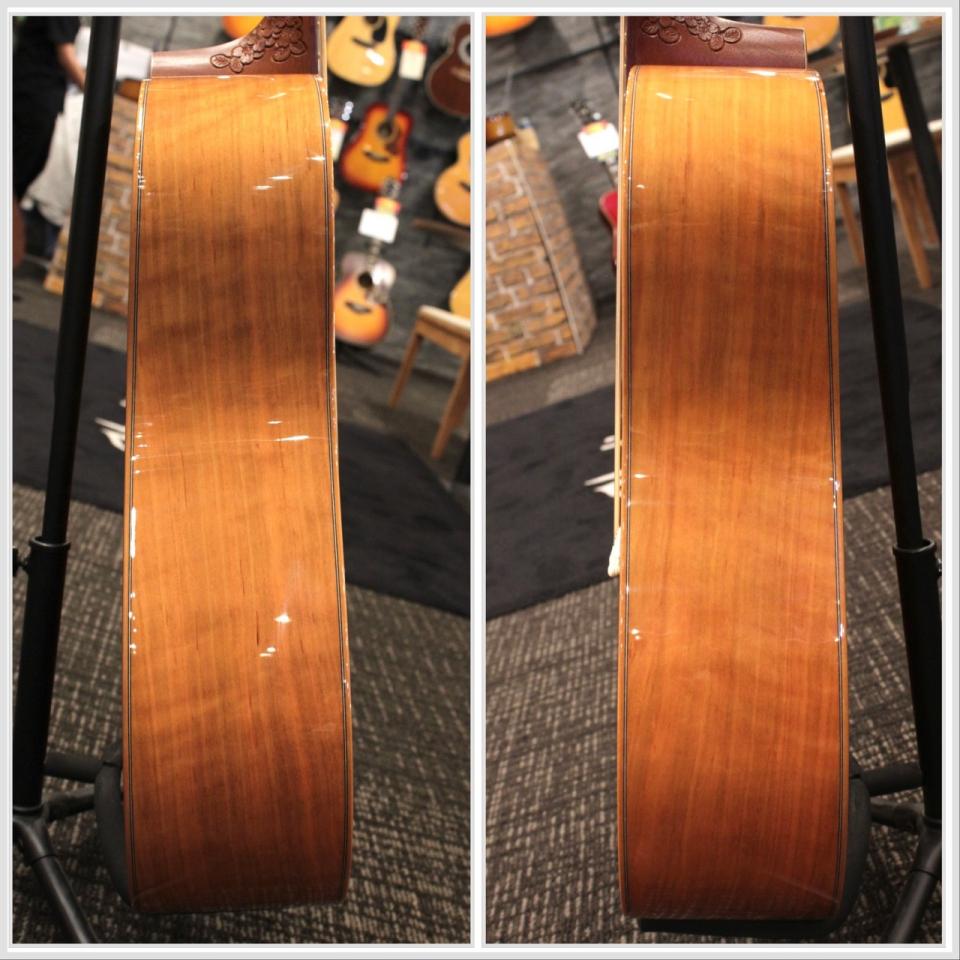 内部構造にはスキャロップ仕様のブレーシングを採用。これにより、山桜の持つ甘く豊かな中域がしっかりと引き出されています。フレットはJescar社のEVOシリーズを使用し、耐久性と音抜けの良さも確保。