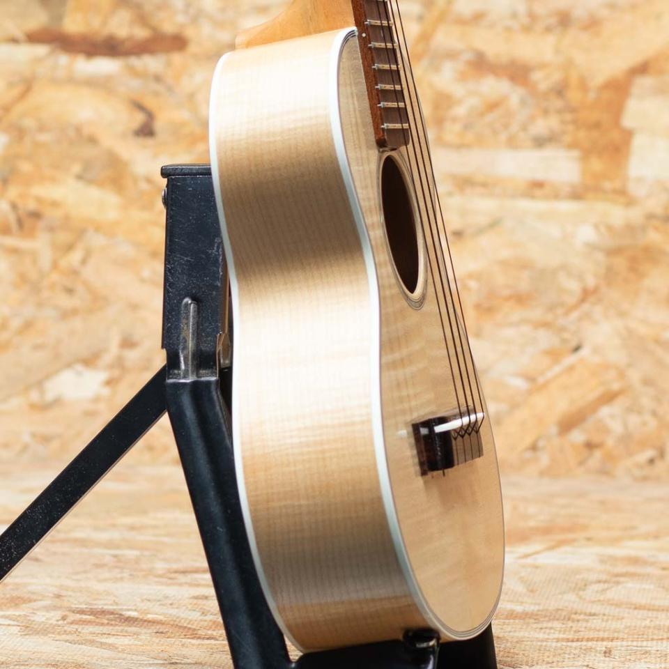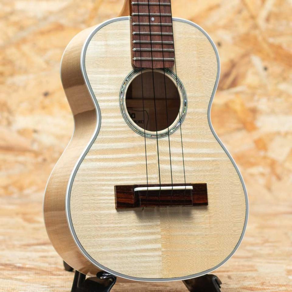 京都にて占部英明氏、息子の直宏氏により手掛けられる国産手工ブランド。きれいな杢のホワイトシカモア材ボディ、コンサートモデル。
