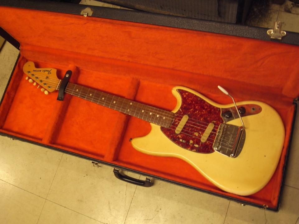 オリムピックホワイト&べっ甲柄ピックガードがかっこいい65年製のMUSTANGです。