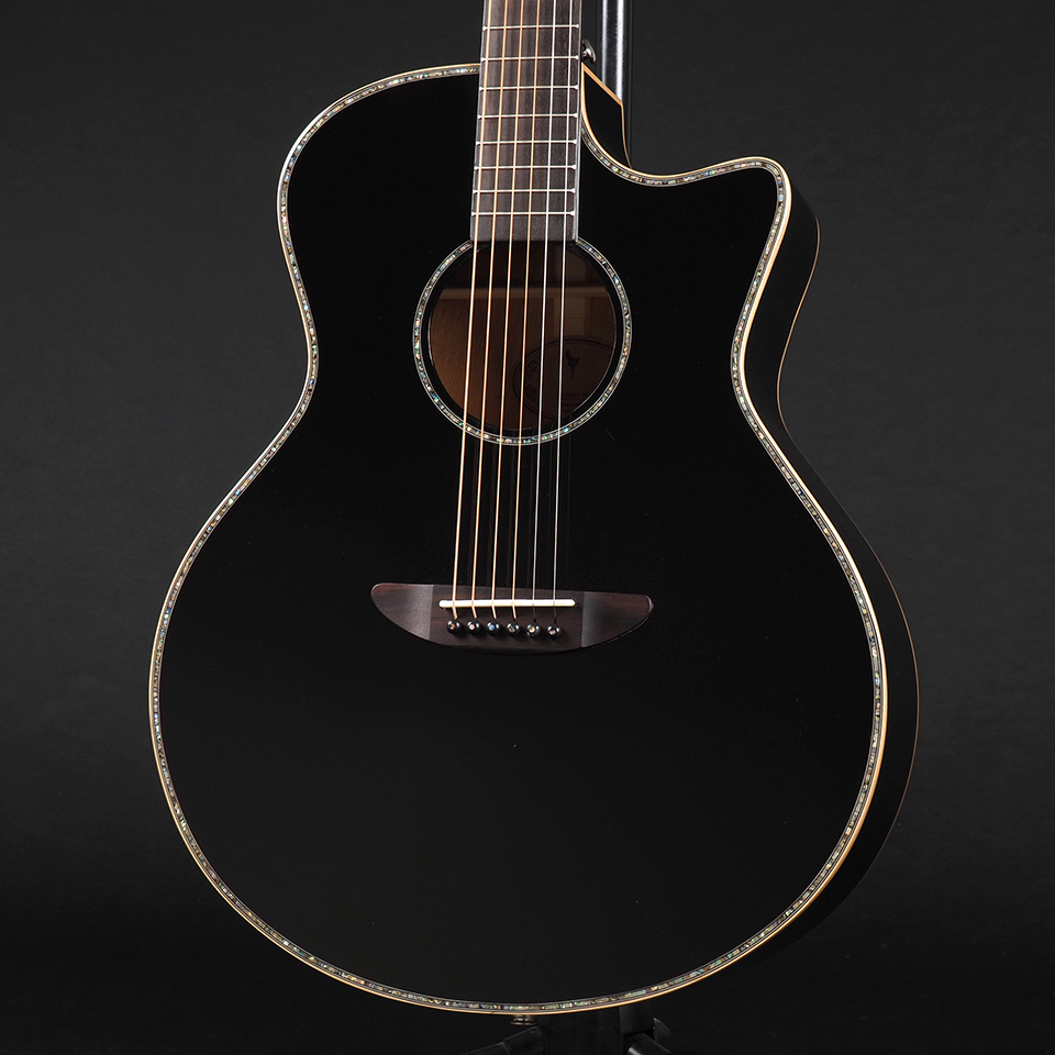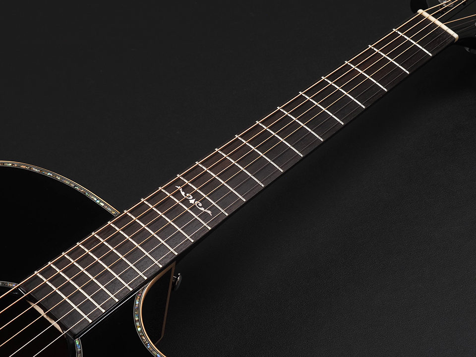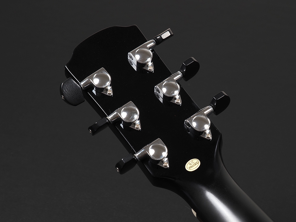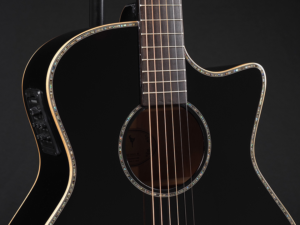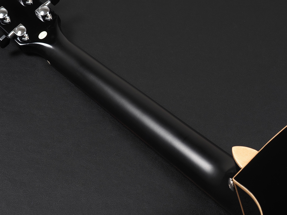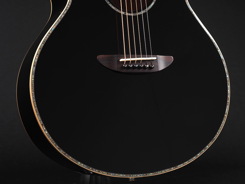外観面でも、光沢のあるブラックカラーとアバロンパフリングのコントラストが非常に美しく、さらにメイプル材のウッドバインディングが上品なアクセントを添えています。