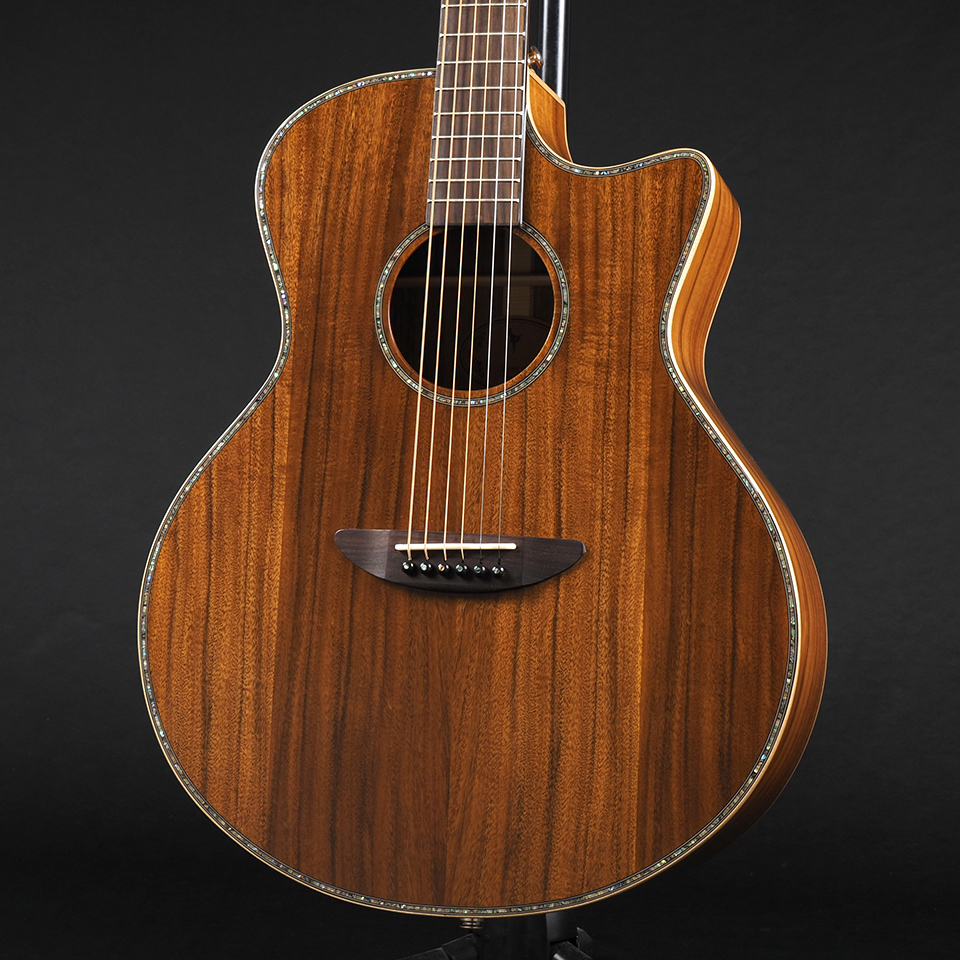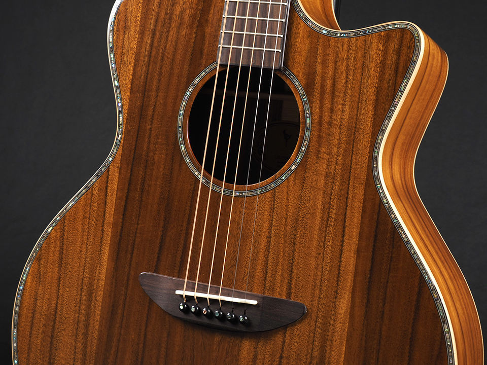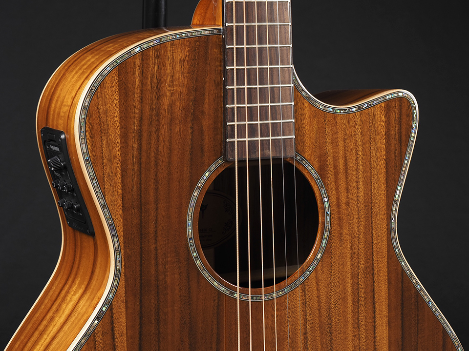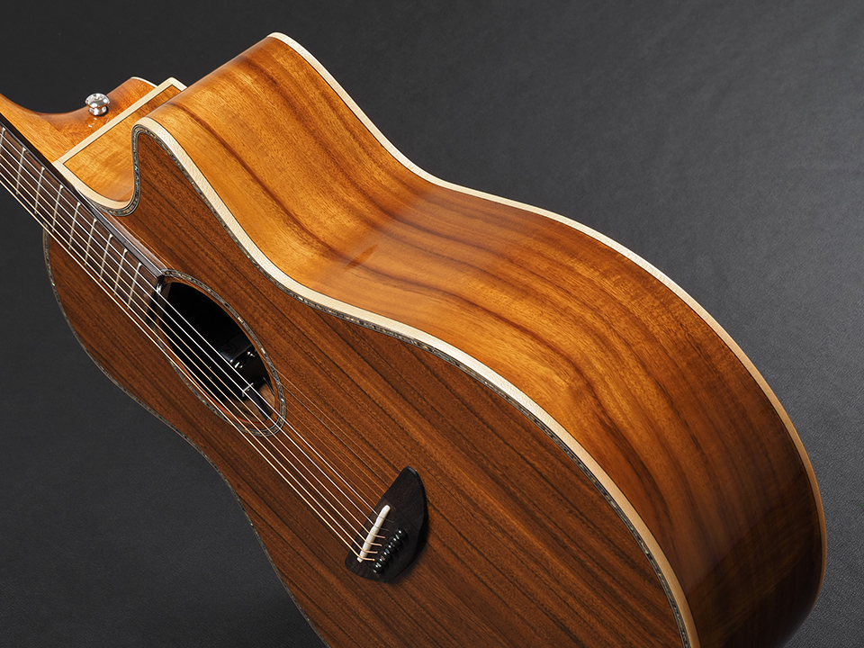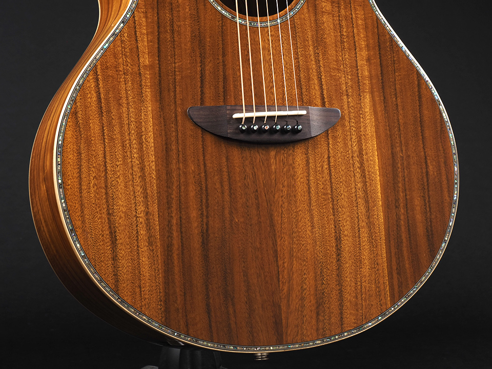 トップ・サイド・バックすべてにTaiwanese KOAを使用し、木のぬくもりと透明感のあるサウンドを実現。さらに、メイプル材のウッドバインディングやアバロンパフリングなど、細部まで丁寧に仕上げられた外観は、見た目にも高級感を漂わせます。