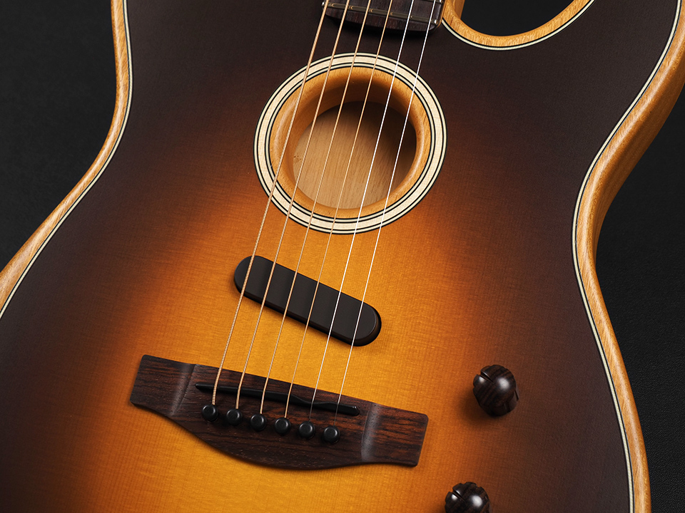 Fishmanアンダーサドルトランスデューサー、Fender Acoustasonic Noiselesピックアップの2種類のピックアップを搭載し、3wayボイスセレクターとModノブの操作により、6種類のギタートーンをベースとした多彩なサウンドバリエーションを生み出します。