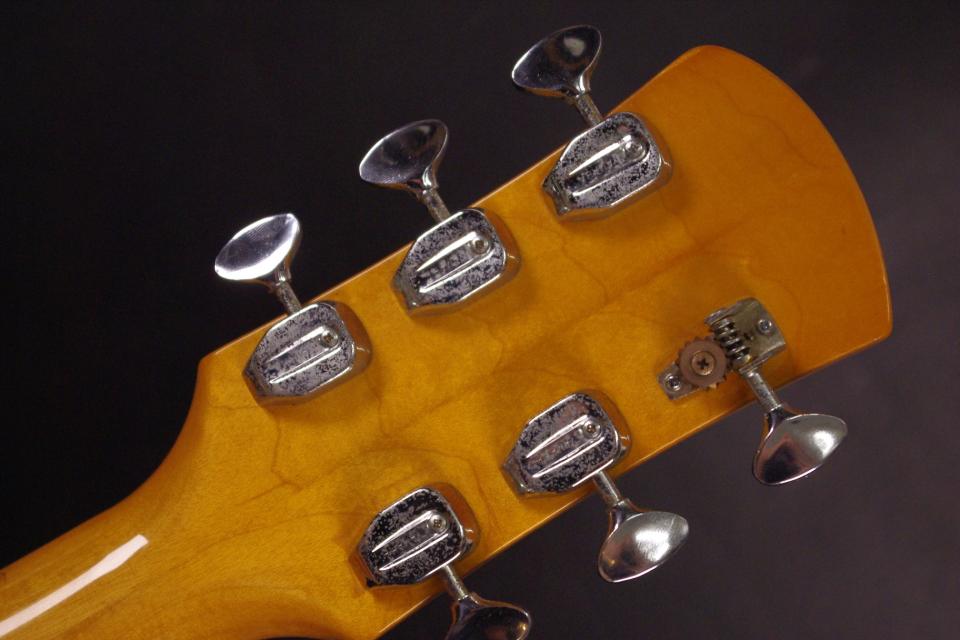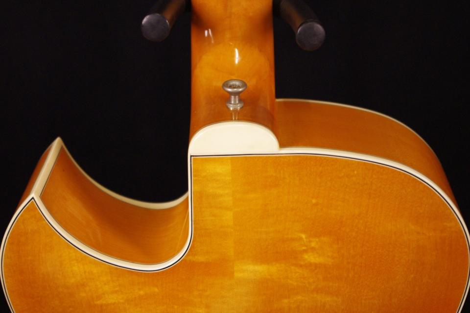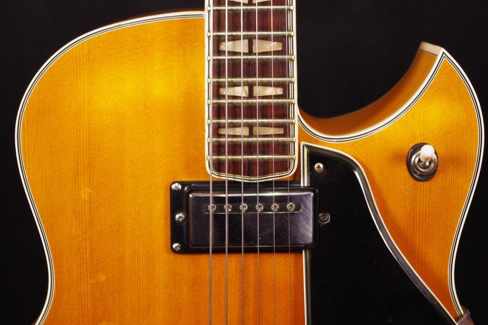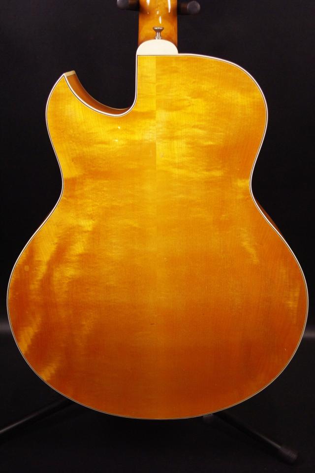 1960年代後半から1970年代初期にかけて生産されたヤマハのフルアコ AE-11がナチュラルフィニッシュで入荷しました!!スプルーストップ、サイドバックにはメイプル材、指板にはローズウッドを採用した16インチほどの扱いやすいフルアコです!ヤマハ独自のパーツで丁寧に製作されておりルックスも味わい深いものがあります!コントローラのキャップが欠品、ペグは4弦のカバーが欠品していますが問題なく機能しています。主なパーツはオリジナルで残っていました。50年以上経過しているわりには傷は少なめで全体的に綺麗に残っています。ネックヒールへはストラップピンが打っています。ナット幅は約42mm近くの握りやすいやや細めのグリップで0フレットを採用しています。ネックのアングルも理想的でトラスロッドの動作も問題なく機能しました。フレットの減りも少なめで長期で気にしないでお使いいただけます。弦高もハイポジションまで押さえやすく調整していますがお好みに合せた微調整にもお応えいたします。甘く乾いた味わい深いサウンドで仕上がっています!ハードケース付。