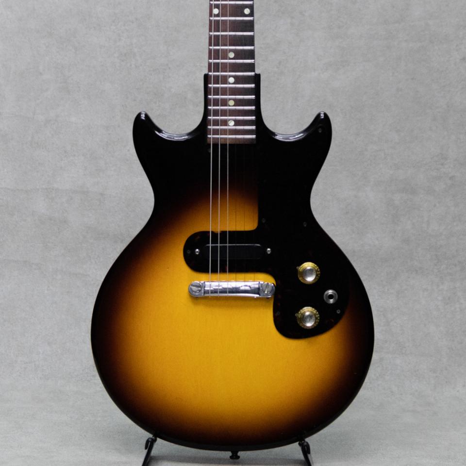 1960年登場のEpiphone OlympicはGibson "Melodymaker"の従妹ともいえるラインナップで、当時の普及価格ソリッドモデルとして同じカラマズーの工場にて製造がされました。実はMelodymakerよりも細かな仕様変更が多いOlympic。登場初期は"MM"と同じシングルカット、62年頃ダブルカットスタイルに変更、しかしそのすぐ後には兄弟機のCoronet、Wilshire、Crestwoodとともに、Epiphoneオリジナルのダブルカットスタイルに変更がされ、Melodymakerの単なるコピーではなくなっていきます。本器はMelodymakerに倣いシングルカットデザインからダブルカットへと変更がされた2期目デザインの63年製。約42.9mmナット幅のレギュラーネック、ハカランダ指板、マホガニー1ピースボディ。握り応えの心地よいネックプロファイルと、軽いボディから放たれる軽快ながらもラウドな広がりを持った響きが楽しい一本。素体の鳴りが良く、思いのほかボディから豊かなサスティンも感じられます。この頃はヘッドストックの形もまだGibsonヘッドの名残を残したデザイン性ある造詣。こちら全体的にとてもコンディションの良い印象で勿論経年相応のウェザーチェックはあるものの塗装表面の艶感をしっかりと残しております。細かなうち傷、ボディバックのバックル痕等あるものの、顕著に外観を損ねるものはございません。ロッドの調整を含め良好なネックコンディション。ラップアラウンドブリッジがクロームメッキの為、少し後の年代のものに変わっている可能性がございますが、同モデルに使われていた純正パーツです。可愛いルックスながらまさにヴィンテージらしい風格をしっかり備えた魅力的なモデル。ぜひお見逃しなく。当時物のチップボードケースが付属いたします。