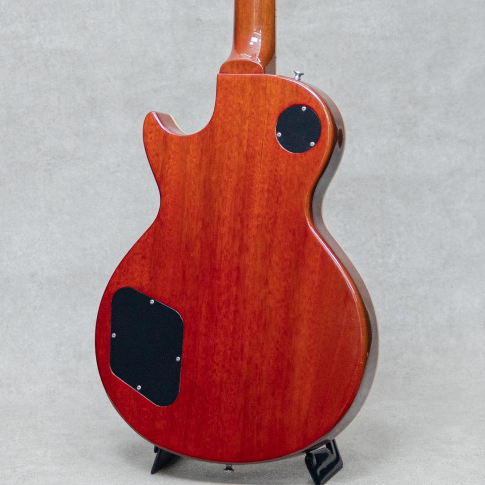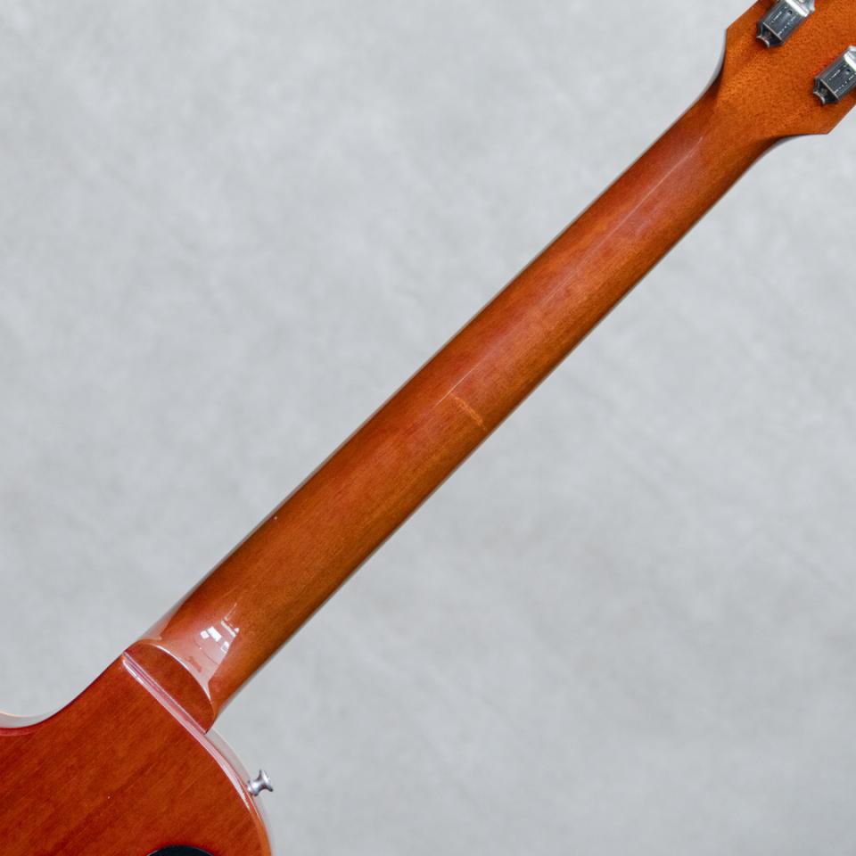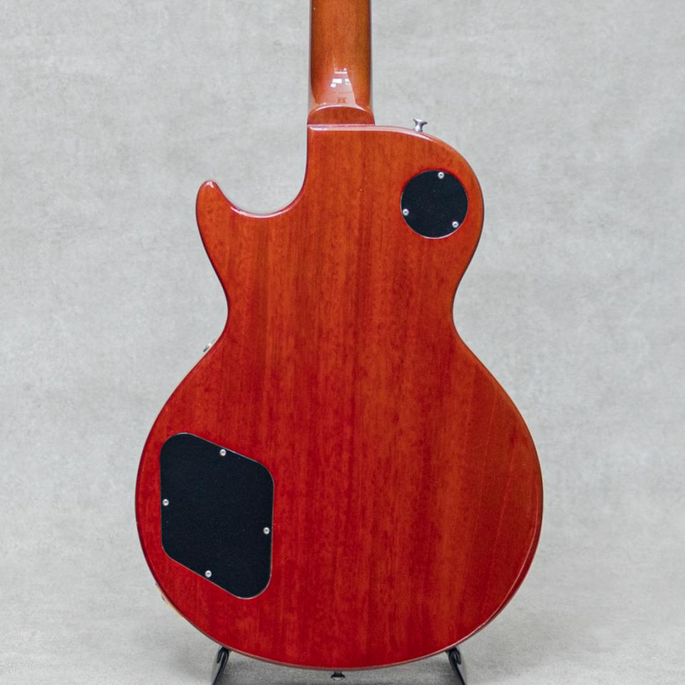 玄人志向なプレーントップ、握り応えのあるネック、無骨な魅力を持った1958 Les Paul Standard Reissue、"R8"。本器は本器は薄いバインディング/トートイズシェル・ポジションマーク/アルミテールピース/バンブルビーコンデンサといったアップデートを経た2004年製、一時採用がされなくなってしまうアニリンダイのによるバックカラーも健在の時期で、リアルな滲みもまた人気のディテールです。加えて本器は珍しい1ピースメイプルトップを採用した、リミテッドオーダー品。R8ながら、うっすらと上品なフィギュアドがまたリアルで骨太なカッコよさを持った1本。ピックアップはBusrt Bucker1&2搭載期。リアピックアップで気持ちよくドライブさせた際の迫力とバイト感はさることながら、ファットでありながらも締まりがあり埋もれる事のない存在感を見せるフロント、そしてセンターから生まれる抜群の鈴鳴り感溢れるトーンは、紛れもなくレスポールのポテンシャルを感じる要所と言えるでしょう。こちら経年を鑑みるとかなり綺麗な印象を残した外観。細かな擦れや小傷はありますが、大きく目立ったダメージは一切なく、ロッドの調整を含め良好なネックコンディション、フレットの減りも見受けられず、即戦力でお楽しみいただけます。認定書は欠品、オリジナルハードケースが付属。