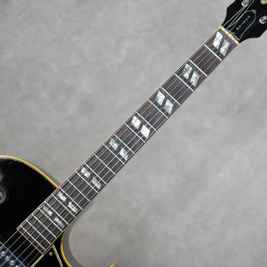ギブソンアーチトップのスタンダードとして燦然とその名を歴史に刻むモデル"ES-175"。16インチのラミネイトメイプルボディ"というスタイルはアーチトップギターの標準の一つとしてあらゆるメーカーにの指針とされています。本器はサウンド・ルックスともに50年代の王道とはまた違った、ロックなテイスト溢れる年式、68年製レアなブラックフィニッシュ。ナンバードPAF、約40mmナット幅のナローネック、ダブルリング・ダブルラインのクルーソン、ソンブレロノブ。クロームメッキパーツにオールブラックフィニッシュが見事に映える”いなせ”な佇まいの一本。単色カラーによく感じられる独特のコンプレッション、単音単音にシャープな粒立ちを持ちつつ、乾いたウッディなトーンが響くエアー感。この時期のナンバードパフらしい適度なパワー感で明るく軽さのある出力とも相まって、スナッピーなスタイルにはもってこいです。こちらおそらくロトマチックタイプのペグが換装されていた履歴があり、ペグ径が約10㎜に拡張をされています。現在はコンバージョンブッシュを利用して元のクルーソンのスタイルに戻っております。(オリジナルのペグブッシュもケースに残っています。)またその際にヘッド裏の増設ビス穴を埋めたのか、ネック裏2フレット辺りからヘッド裏一面にのみブラックのオーバースプレーがされておりますが、しっかりと色合わせがされており肉眼では色の違いはほとんど分かりません。その他全体的に経年相応のウェザーチェック、細かな塗装チップ、打痕などはあるものの、外観を損ねるダメージはございません。フレットはこの年代らしく幅広で背の低いタイプ。使用感は感じられるものの顕著な消耗は感じられません。その他、詳細等お気軽にお問い合わせください。ジャズ・ブルースは勿論、ロックやロカビリーなアイテムとしても抜群な一本。是非ご検討ください。
