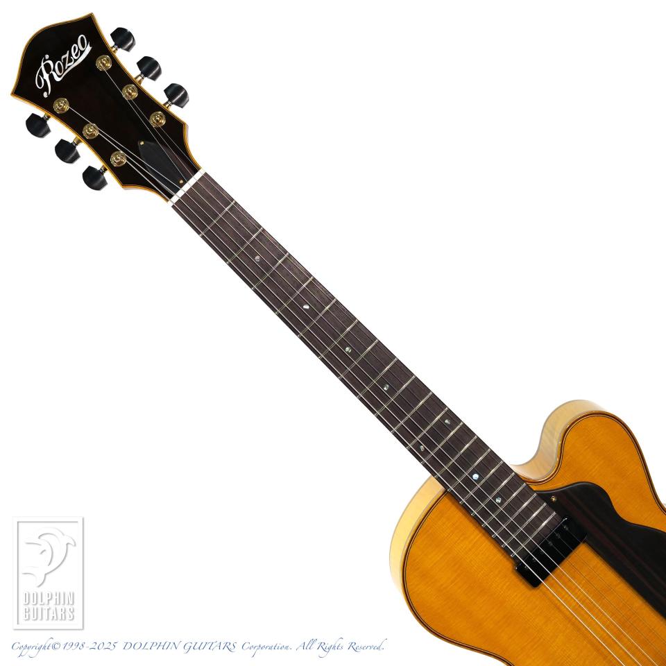 ピックアップはオーソドックスなフロント1ハムバッカーのスタイル。甘さの中に程よく芯があるサウンドは、ジャズはもちろん、弾き語りで使用しても面白いかも知れません。薄いボディ厚は取り回しが良いだけでなく、アンプで鳴らす際のハウリング対策としても優位性を誇ります。