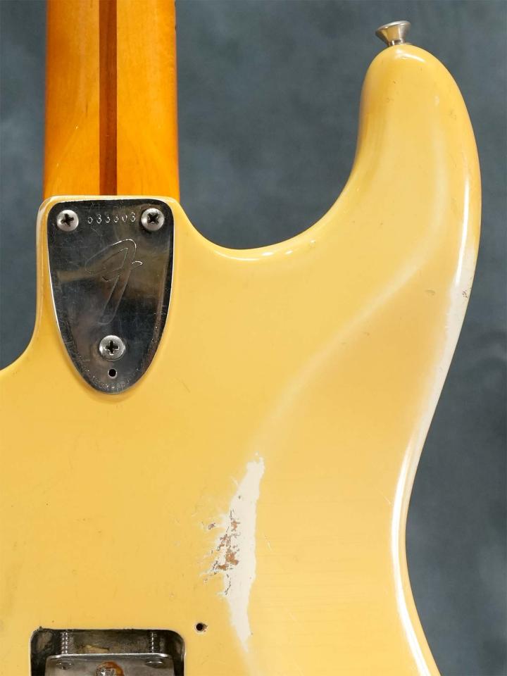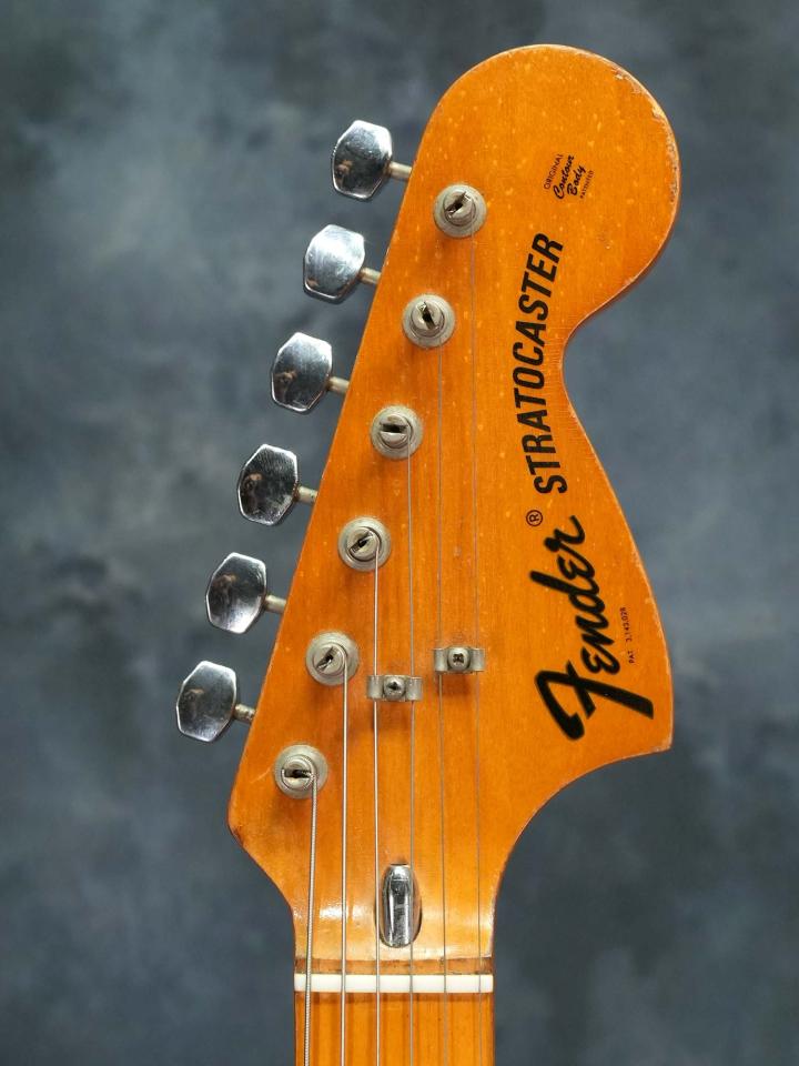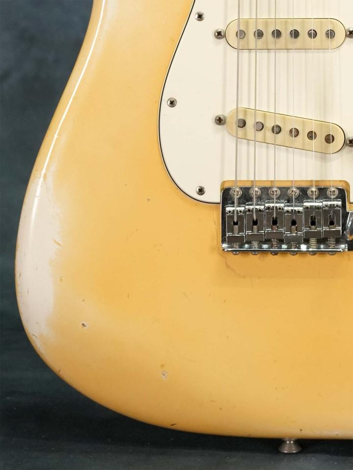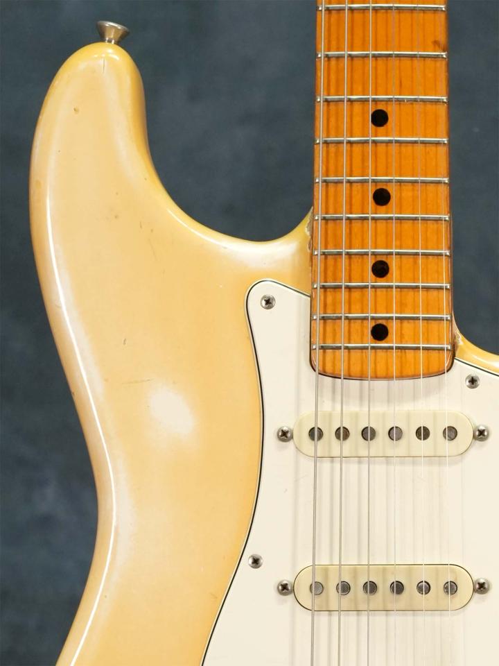 バーズアイの出たメイプルネックに軽量なアルダーボディ、パーツ交換や各部に手が入っている事でオリジナル度は低いものの実用的な作業が施されており、適度に枯れたアコースティック感を残しつつ高域のしっかりした切れの良い音色が心地よく、しっかり使える格好良い70s Stratocasterをお探しの方にオススメの一本です。