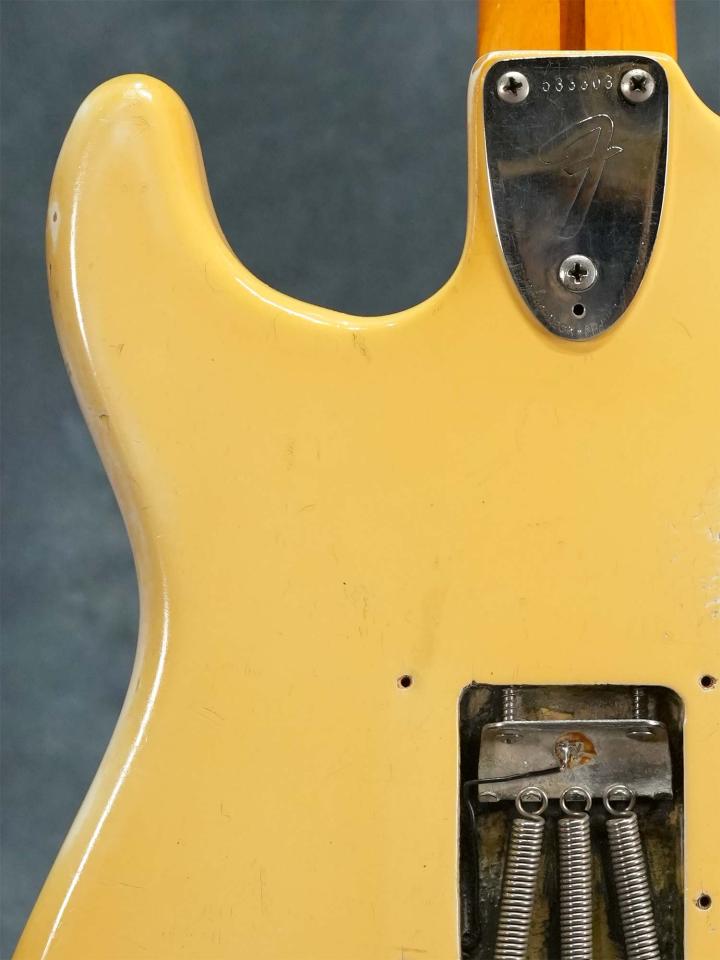 3点止めの1-Pieceメイプルネック、アルダーボディ、Fender F-Keyチューナー、トレモロブロックとプレートが一体型になったダイキャストのシンクロナイズドトレモロとダイキャストサドル、色焼けしたボディに加えて各部のダメージなどしっかり弾き込まれてきた事が伺える経年相応のコンディション。