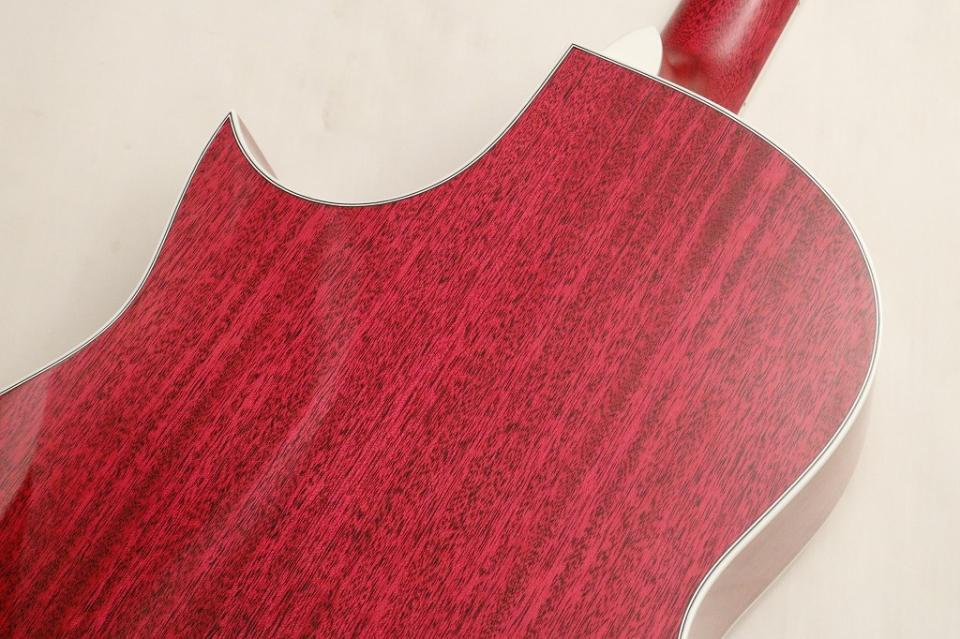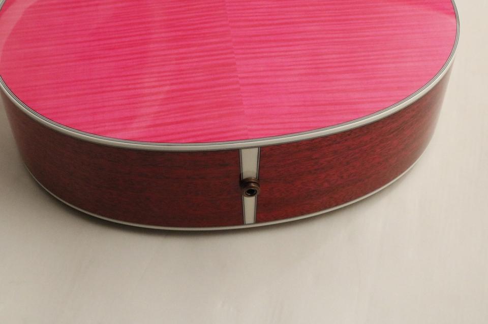 Morris ハンドメイドプレミアムシリーズのカラーモデル人気のシースルーピンクモデル。トップ材にはイングルマンスプルースに杢目の美しいフレームシカモアを化粧板として合わせて作製をしています。カラーモデル、杢目を強調したモデルとしては非常に優れたサウンドを持っており、エレアコ・カッタウェイモデルながら生音も魅力的なモデルです。カラーと併せて特徴的なフローレンカッタウェイは指板最終フレットよりも高い位置まで深くカーブを描いておりよりハイポジションへのアプローチがしやすく、ボディ厚が薄めで抱えやすく演奏性に長けたThinクラシカルオーディトリアムボディ。立ち上がり良く大きな響きが出やすいマホガニーの特性と652mmの長めの弦長から来るハリのある響きが混ざりクリアで素早い立ち上がりと軽いタッチで大きく響いてくれる迫力のあるサウンドになっています。反面強くピッキングをした時は少し割れたような荒っぽい響きになり、ピッキングの強弱でサウンドキャラクターが変わっていく気持ちよさと魅力があります。さらに長めの弦長の為ダウンチューニングや変則チューニングでも十分なテンションを確保することが出来、アコースティックギターの重厚でふくよかな低音を更に楽しむことが出来ます。サウンドホールにはアバロン貝、ヘッドロゴと指板ポジションマークにはマザーオブパールが採用されており美しいフレームシカモアとシースルーブルーの外観の魅力を更に引き立てています。ここまで魅力的なギターをこの価格で手に入れることが出来るのは伝統の国産ギターMorrisだからこそと言えます。ギター上級者のみならず初心者の方でも長く、幅広く弾く最初一本として是非ご検討いただきたいモデルです。是非この機会お手に取って見てください。