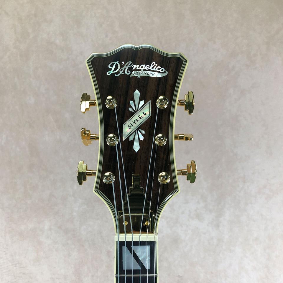 Excel Style Bは、17インチ(431.8mm)幅、3インチ(76.2mm)厚のオリジナル・シェイプのアーチトップ・ホロー・ボディーのモデルです。ディアンジェリコらしさを感じるオリジナル形状のピックガードは、fホールの一部を思わせるデザインで、ブラックとなっています。