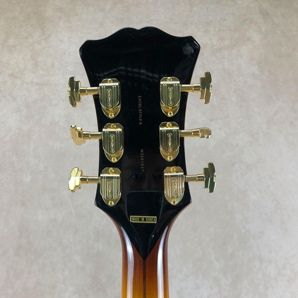 コントロールは1ヴォリューム、1トーンです。ハードウェアはゴールドで統一し、信頼性の高いグローバーのインペリアル・マシンヘッド、エボニー・ブリッジ&ステアー・ステップ・テイルピースの仕様です。