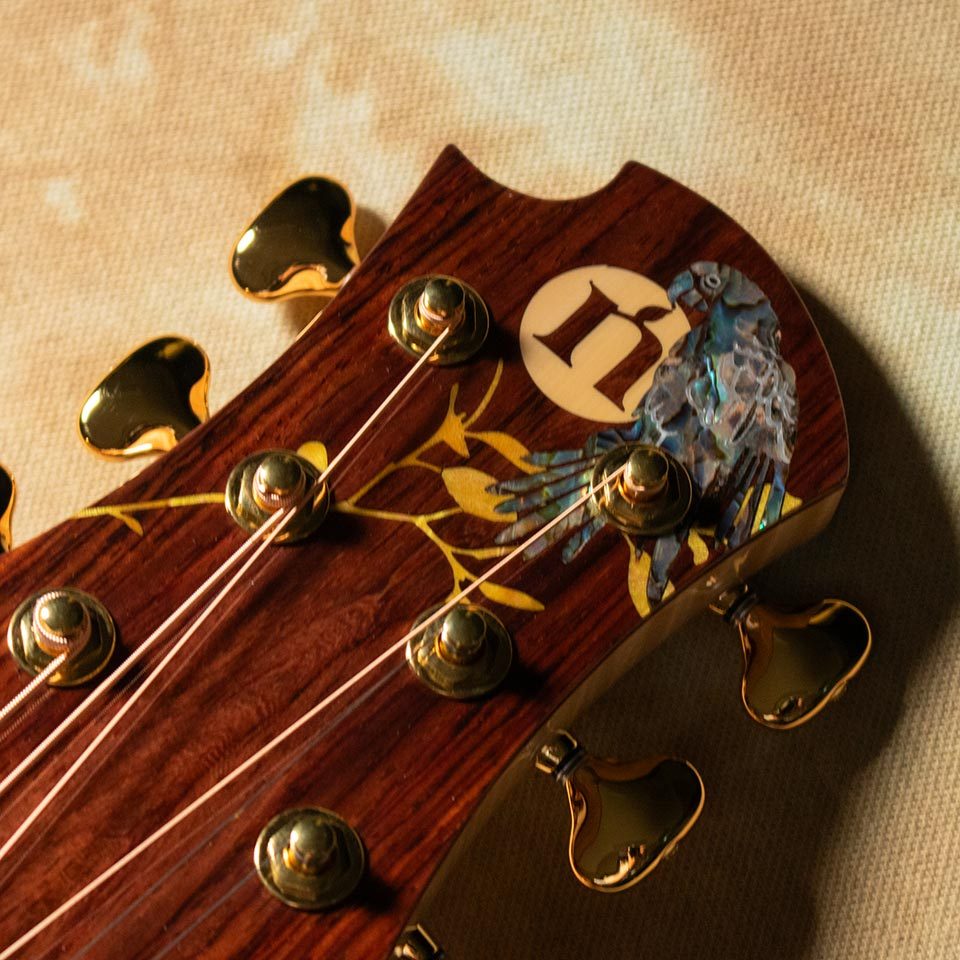一方でヘッドストックには南米やブラジルに生息するコンゴウインコ(アラーラ)をあしらった精緻かつ美しいインレイが目を引きます。