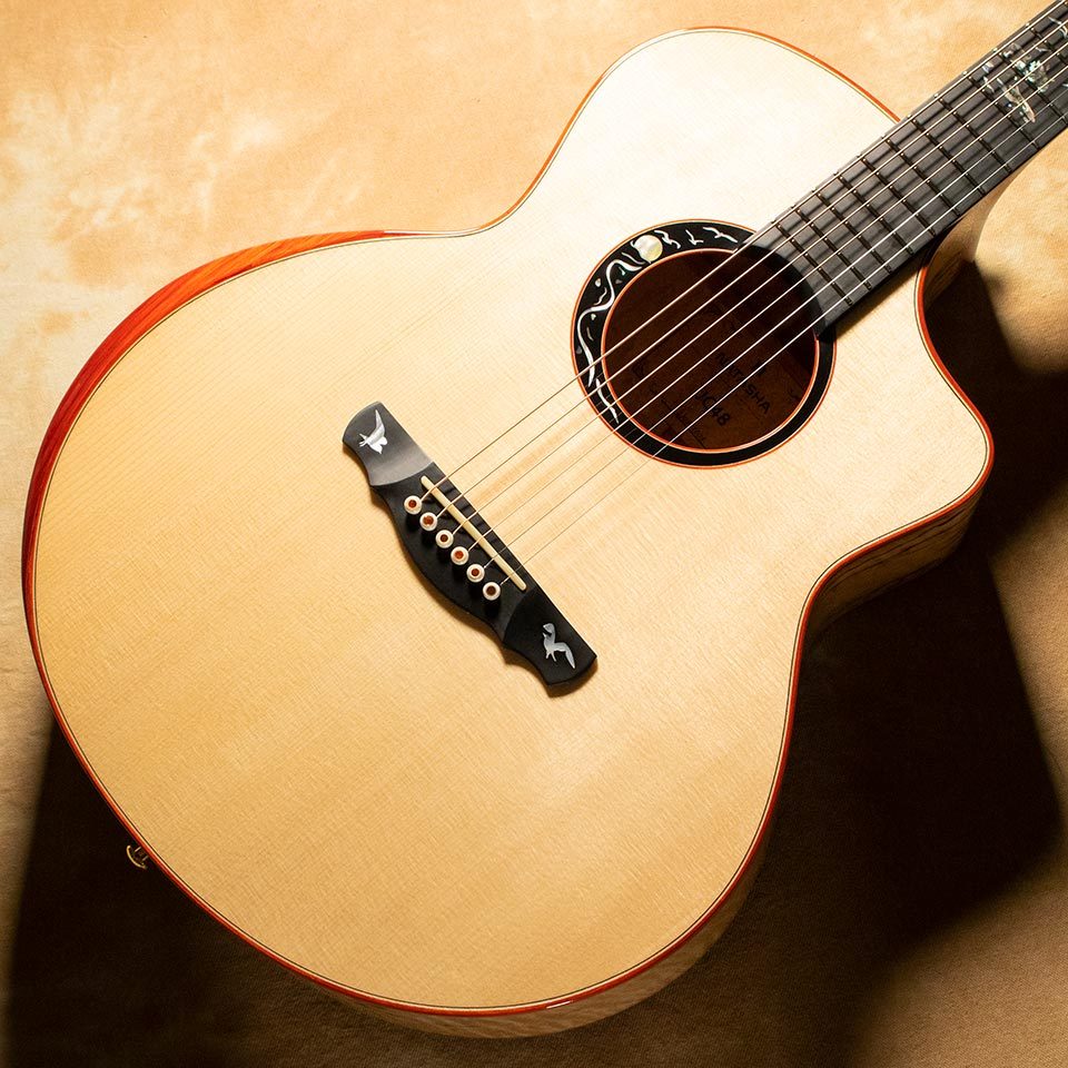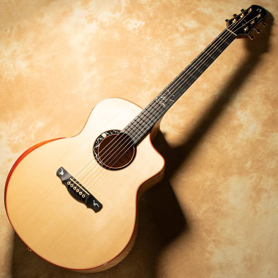 JCシリーズのフラッグシップモデルであるJC-48は厳選されたヨーロピアンスプルースの単板トップに加え、なんとサイドバックはスポルテッドメイプルを使用。