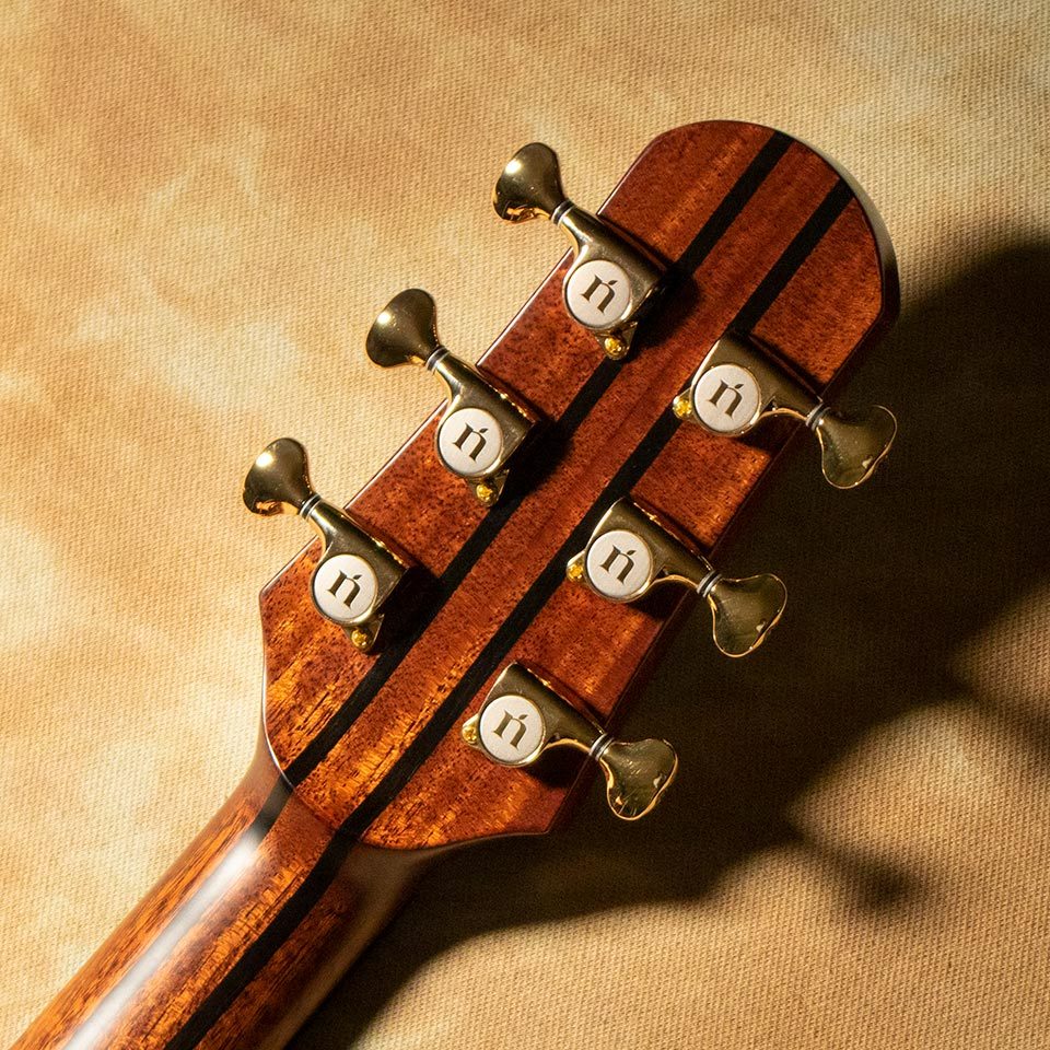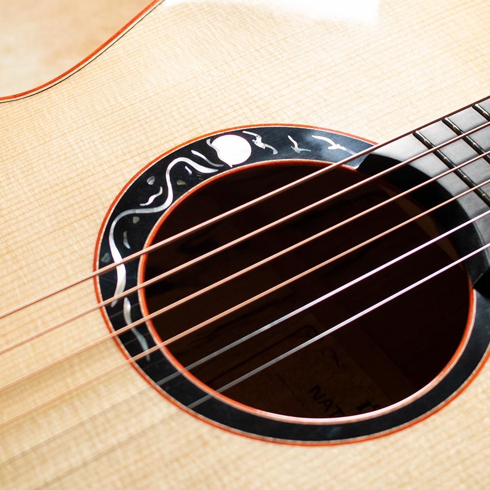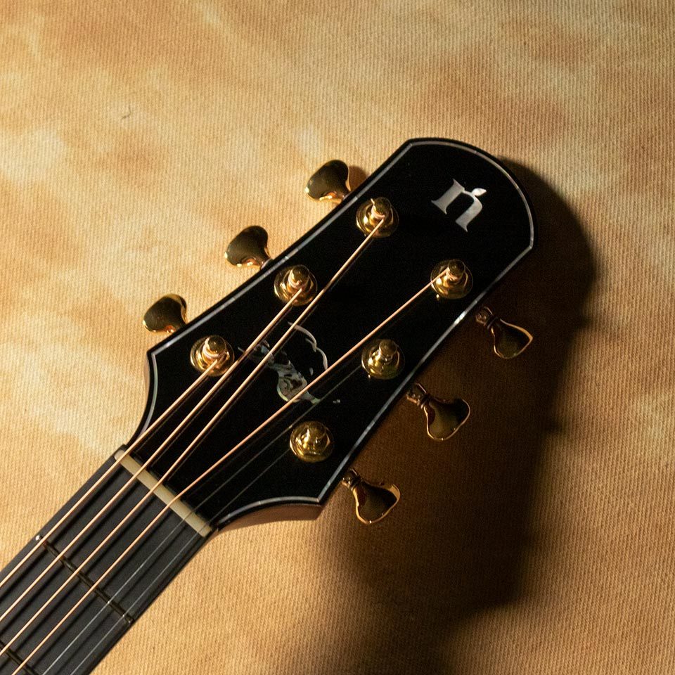 埋め込み式のナットやフレットに加え、ロゼッタや指板のインレイ ワークからもNATASHAの圧倒的技術が伺えます。