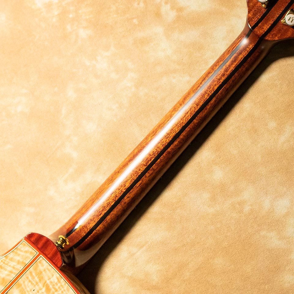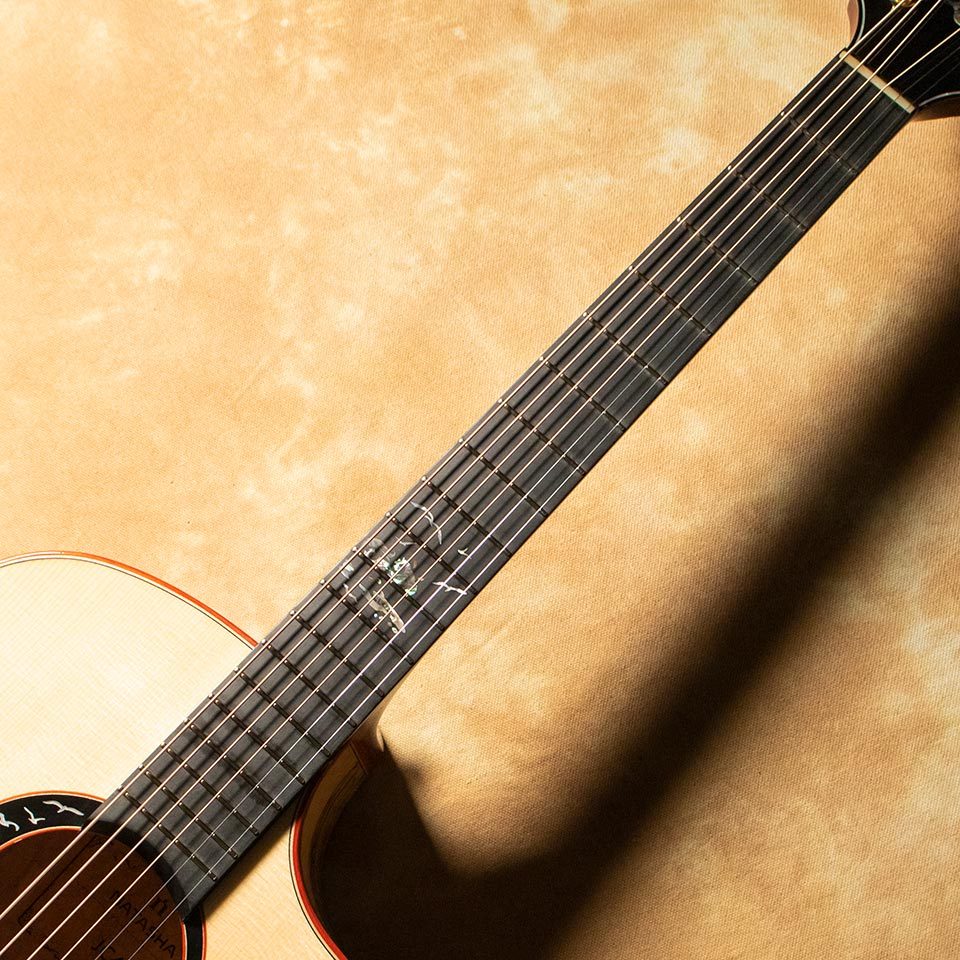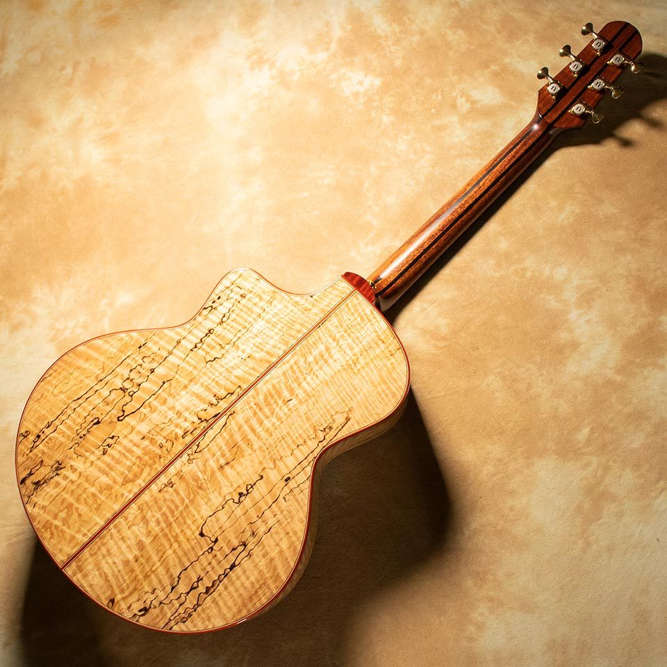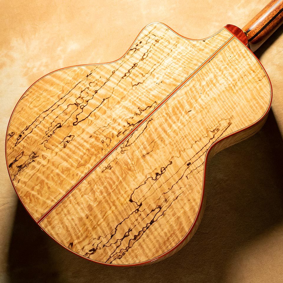 バック&サイドにスポルテッド・メイプルの単板を使用。スポルテッド・メイプルはその独特の杢目が人気ですが、素材としては極めてレアであり、割れも発生しやすいため取扱いが難しく、アコースティックの単板として使用できる材は非常に限られています。メイプルならではの明るい音色が特徴で、フィンガーピッカーのスピーディーでダイナミックな演奏に確実に応えるモデルです。