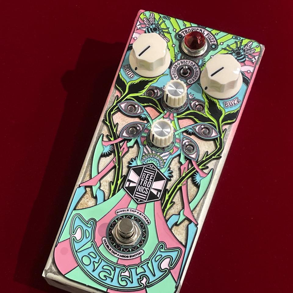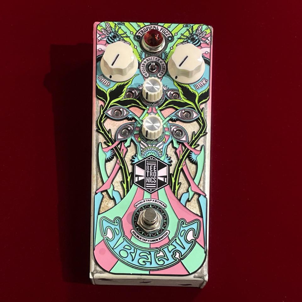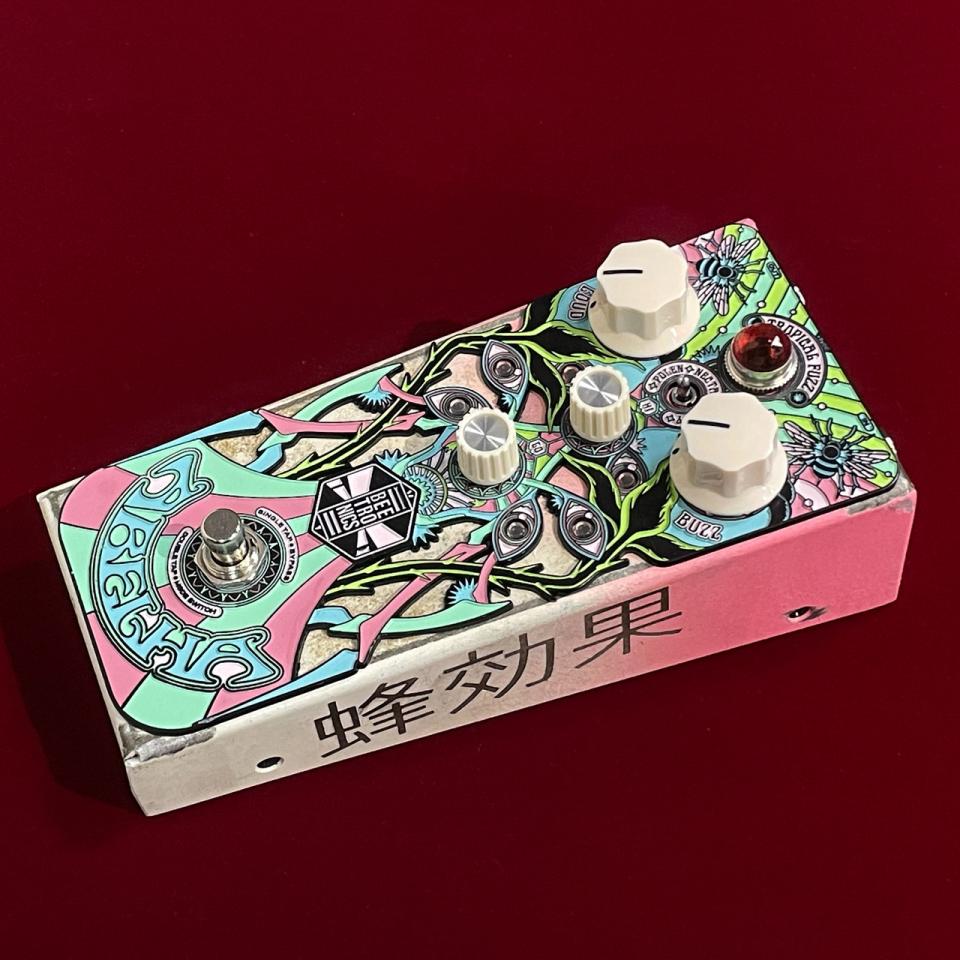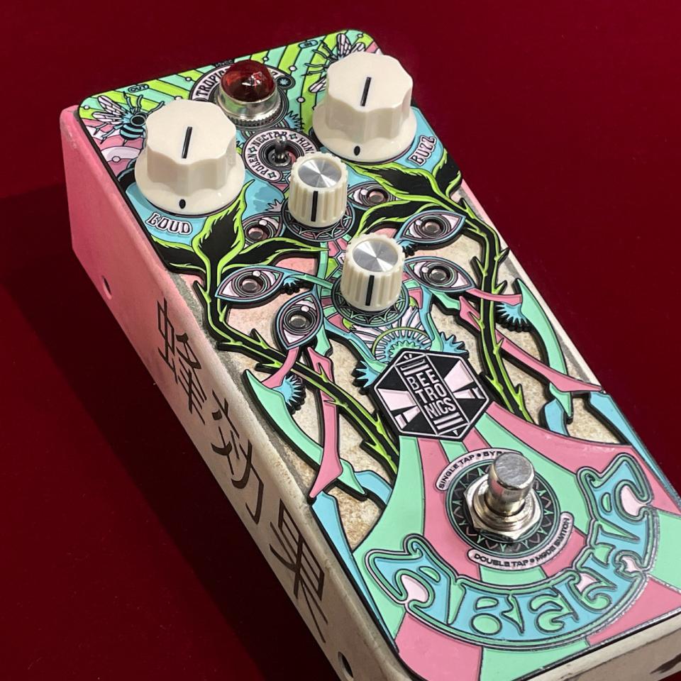 フロントパネルにはサイケデリックにデザインされた蜂が描かれ、レリーフを埋め込んだようなペダルデザインも魅力的。もちろん他のBEETRONICS製品同様、基板にも蜂の意匠があしらわれています。