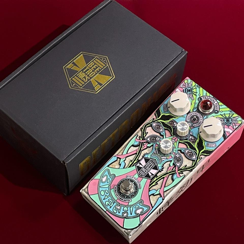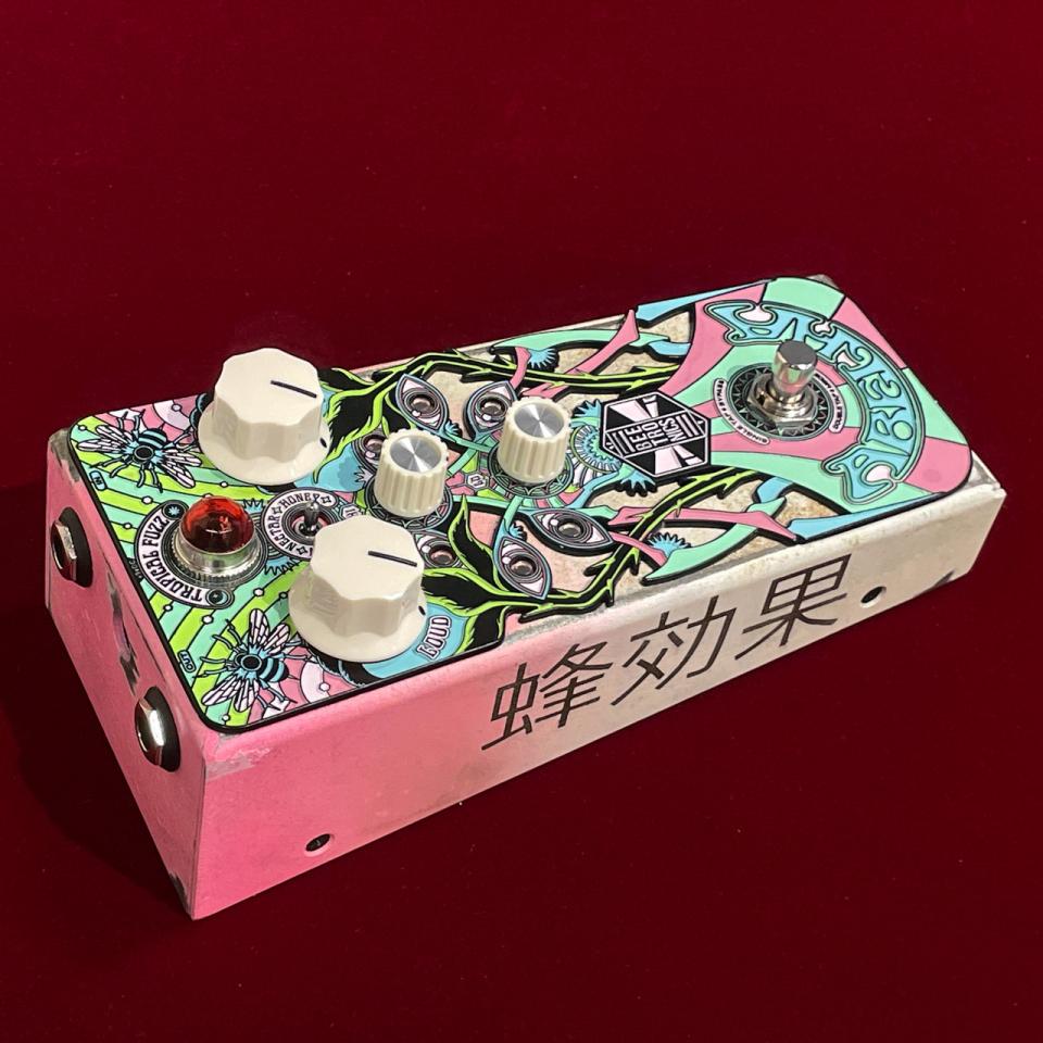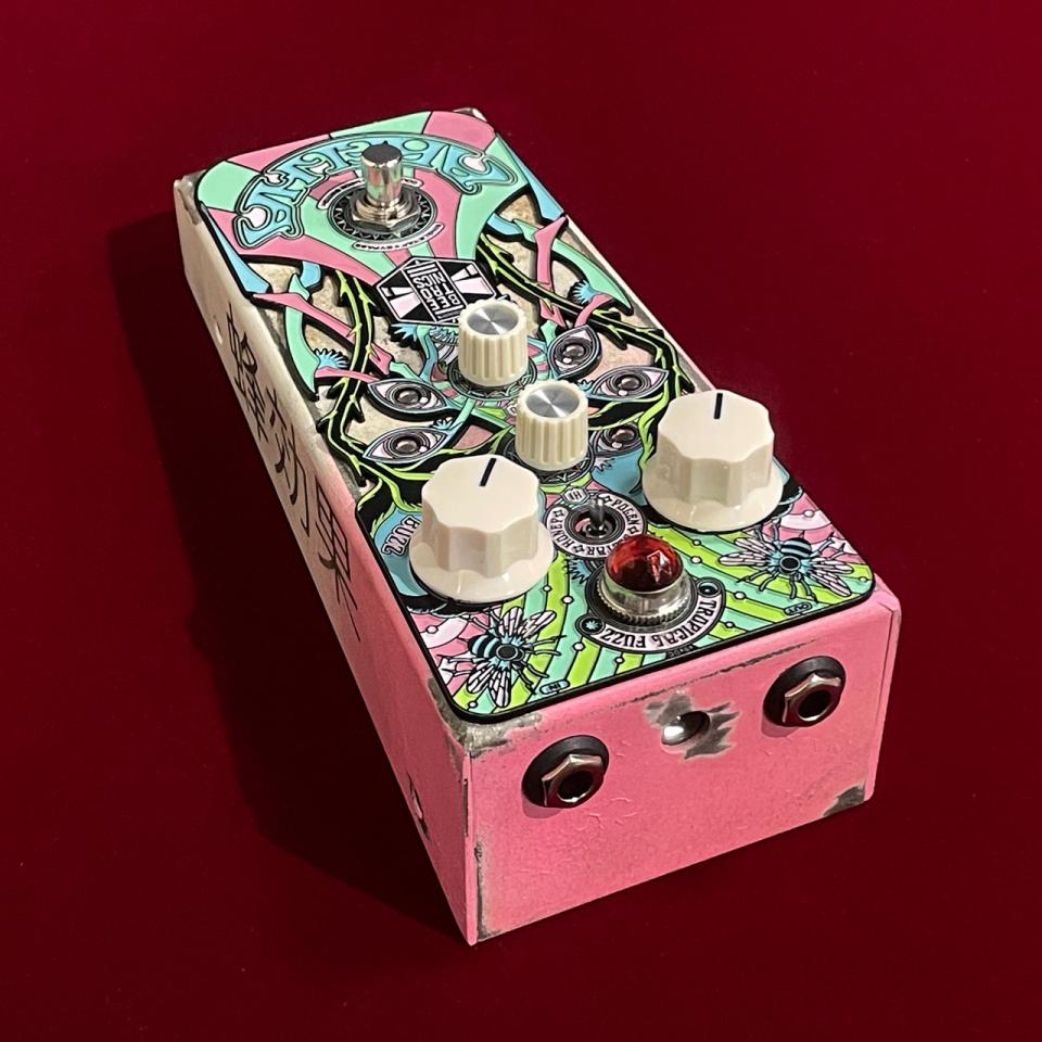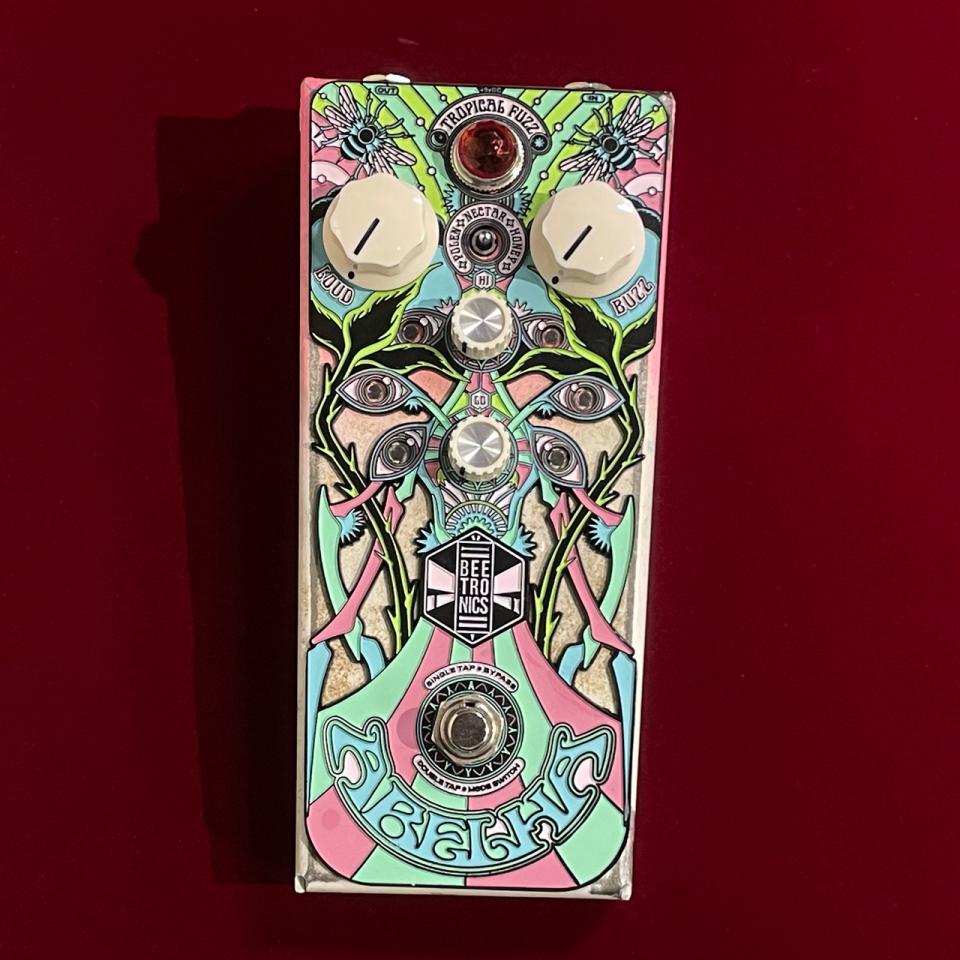 フロントパネルにはサイケデリックにデザインされた蜂が描かれ、レリーフを埋め込んだようなペダルデザインも魅力的。もちろん他のBEETRONICS製品同様、基板にも蜂の意匠があしらわれています。