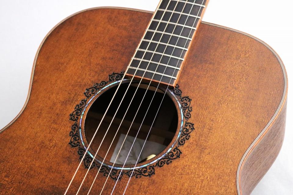 また、サウンドホールのロゼッタ部にはレーザーによる細かな装飾や指板のワンポイントのインレイなど、美しいカラーリングを邪魔しないさりげないデザインもまたモデルの魅力を一層引き上げております!