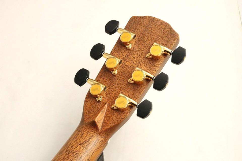 ボディバックに伝統的なラダーブレーシングの構造を持った“スタンダード・ラウンドバック・スタイル”と、ネックとヘッドの境目に”ダイアモンドボリュート”。シトカスプルース単板トップとインディアンローズウッド単板サイド・バック。オール単板のボディにトップブレーシングはフォワードシフトXブレーシング、バックはローズウッド単板にラダーブレーシング。MartinGuitar、GibsonAcousticにおける伝統的な内部構造を採用することで、フィンガースタイルに特化したMorrisモデルにあって伝統的なストラミングサウンドも得られるモデルに仕上がっています。