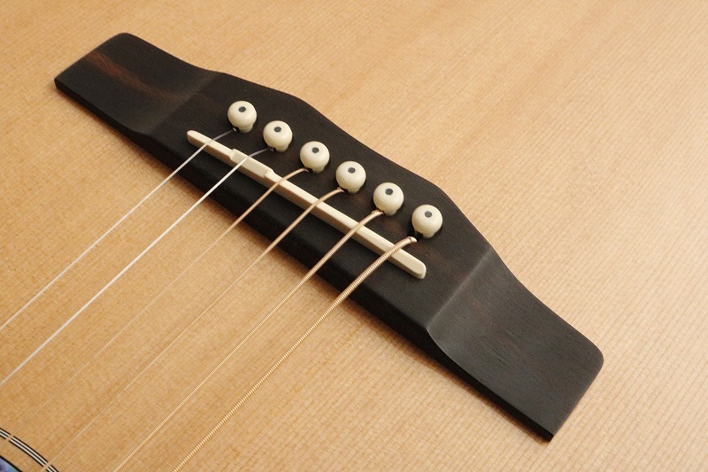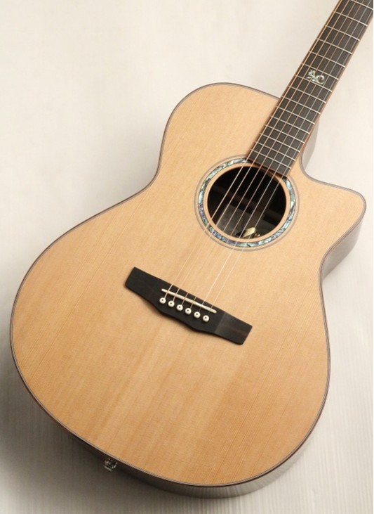 フィンガースタイルに特化し、ソロギターでの演奏性を追求したSシリーズの中心的モデルの一つS-102Ⅲ。2000年、それまで弾き語りを主とする国内アコースティックギターの流れに新たに生まれて定着しつつあったフィンガーピッキングスタイルの演奏を目の当たりにしたMorrisは2001年これから弾き語りを超えてスタンダードになっていくであろうフィンガースタイルに特化したシリーズ「Sシリーズ」を発表します。弦長、ネックシェイプ、ナット溝の位置、ネックの仕込み角度、ボディの構造、サドルの仕込み位置、塗装、細部に渡るまでフィンガースタイルで演奏する事を想定した設計となっているSシリーズ。そのSシリーズのスタンダードであり定番木材の組み合わせを持ったモデルがS-102Ⅲです。アメリカンシダートップとインディアンローズウッドサイド・バック。オール単板のボディにトップブレーシングはXXブレーシングにバックはローズウッド単板ながらディープラウンドにXブレーシングという手の込んだ造りになっています。これにより低音から高音まで淀みが少なくクリアでハッキリとしていながら大きな鳴りと響きの伸びを持った響きを実現しています。特に、重量のあるローズウッドはサスティーンに定評があれど立ち上がりが重たくなりがちで軽いタッチのフィンガースタイルでは鳴らない印象になりがちですが、MorrisSシリーズのローズウッドサイドバックは立ち上がり良く伸びのある美しいサウンドが叶えられており軽いタッチでも気持ち良く演奏が出来ます。派手過ぎずお洒落な外観も魅力。指板12フレットにはリンドウの花を模したインレイが埋め込まれ、サウンドホールロゼッタもアバロン貝の美しい装飾。ボディ全体に色味が明るく美しい杢目をもったコアのバインディングを採用しており木材の温かさを感じる外観になっています。バインディングやインレイだけで見ても非常にきれいなものが採用されており手に取って各部眺めてしまいたくなる外観。ディープラウンドバックならではの迫力がありフィンガースタイル特化モデルながらフラットピックでのストロークサウンドも抜群です!ボリューム/トーンコントロールの無いシンプルかつ高品質なエレアコサウンドを出力可能ななB-BAND/UST-25R搭載でエレアコサウンドGood!是非この機会にお手にとってみてください!