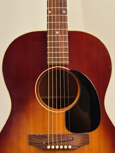 ギブソンの60年代後半らしくナット幅の狭いナローネックに、丸く白いツマミの3連ペグ、サウンドも、ナローネック時期のB-25ですので、ギブソン特融のジャキジャキのストロークサウンドは抜群です。中音域に芯の強さがあるのは小柄ながらもギブソンらしく、ボディ全体が震えるような感覚が良いです。