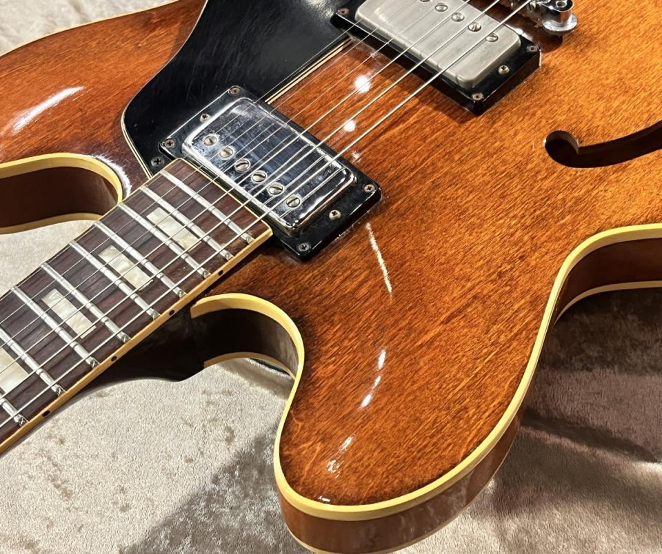 1958年に発表されたES-335TD、TDとはThin(薄い)D(デュアルピックアップ)の略で今ではセミアコの代名詞となっていますが従来のフルアコとは異なりセンターブロックと呼ばれているボディ中央をソリッドメイプル材が貫通するギブソン初のダブルカッタウェイのボディスタイルでネックジョイントも19フレット部になっており最終フレットまでスムースな演奏が可能になり今でも多様なジャンルのギターリストから愛されています。