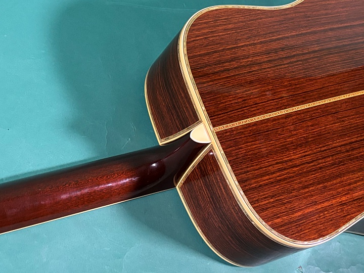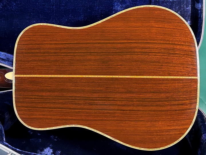 ピックガードはオリジナル風ラッカーコートのものに交換済みで、マーチンクラックはありませんが、わずかなウェザーチェッキングが見られ、内部には割れ止め処置がされています。