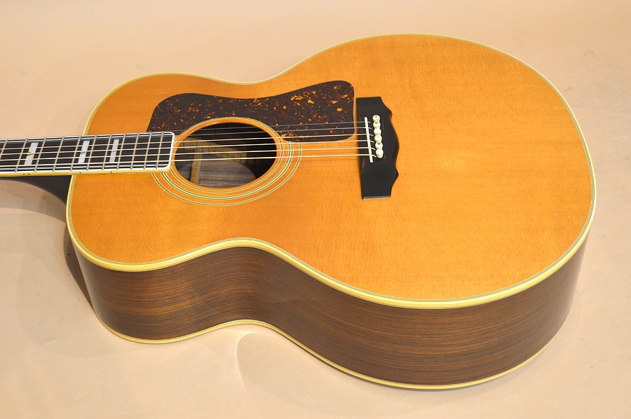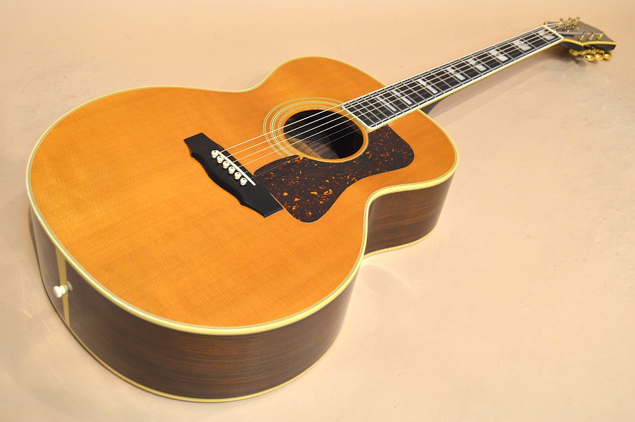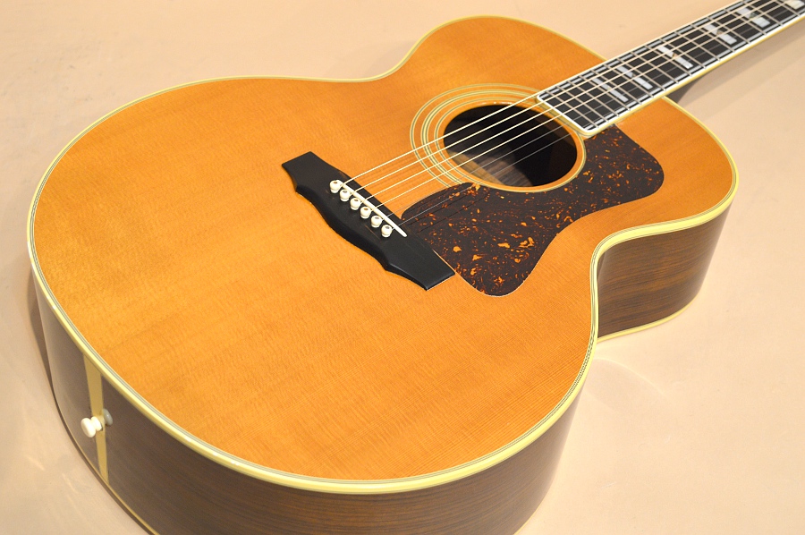 サウンドはガツンと音が立ち上がり、野太く力強く咆哮するパワフル・サウンド!オリジナル・ギルドは重量がかなりありますが、この重たいボディー故の芯が太くトルクの強いサウンドこそがギルド・サウンドの醍醐味かと思います。マーチンなんかと比べるとやや荒削りで男性的なこのサウンドはギルドでしか出し得ない魅力のサウンドです。フラットピックで掻き鳴らせば、ゴツンといった感じで音が立ち上がり、野太い基音にこのボディー形状ならではのふくよかさが加わり、力強くも包容力のあるサウンドを響かせます。フィンガーで爪弾いても、決して重く鳴り過ぎない反応が良く芯のしっかりした出音に、このボディー形状ならではの豊かなリバーブ感が加わり、艶のある美しいサウンドを奏でますので、プレイ・スタイルやジャンルを問わず、あらゆるスタイルでこの楽器の持つ魅力をご堪能頂ける事と思います!